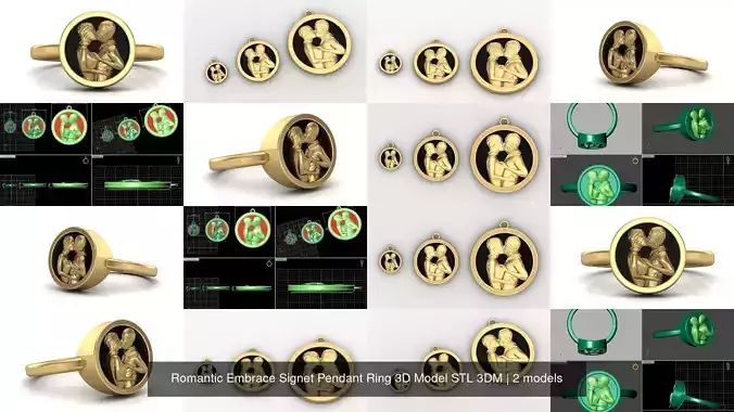 This elegant and unique 3D model features a beautifully detailed signet ring showcasing an intimate moment between two lovers in a passionate embrace. The design is crafted with precision, with a raised gold-like relief set against a contrasting dark background, adding depth and sophistication.