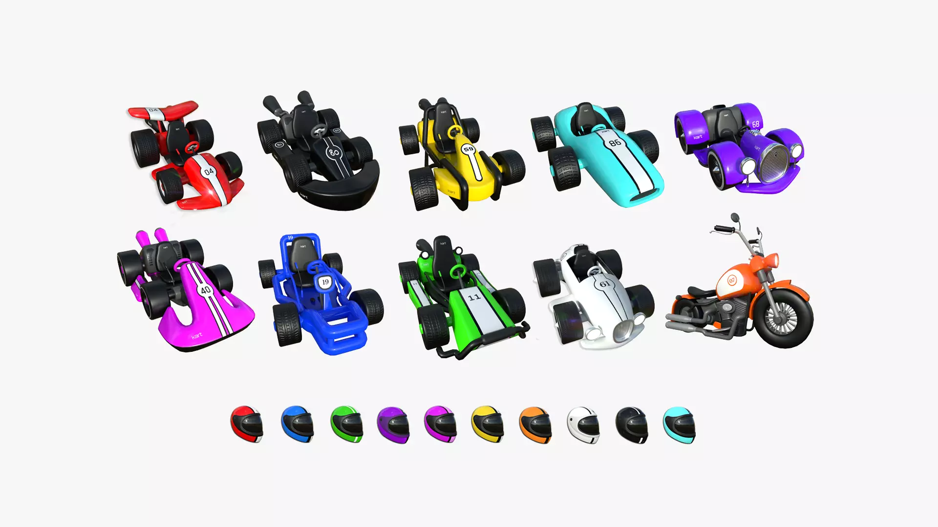 10 Cartoon Karts and Helmets Colored Collection - Vehicle Design 3D Model Pack
