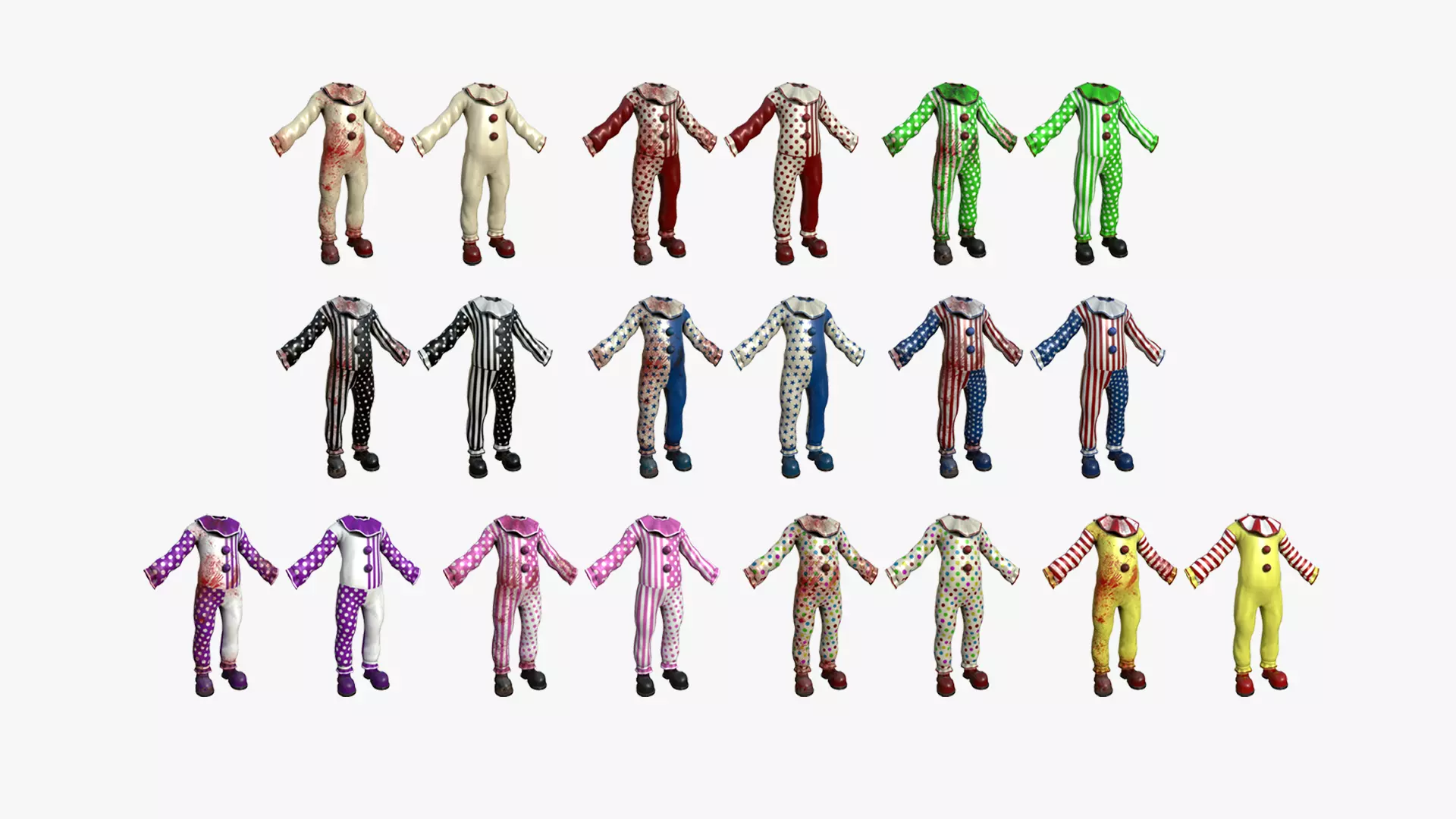 Clown Terror Outfit A - Character DesignTwo versions included per outfit: Normal and Bloody20 textures totalcan be used as character costume/outfit/skin/clothing, or even as a decorative item.