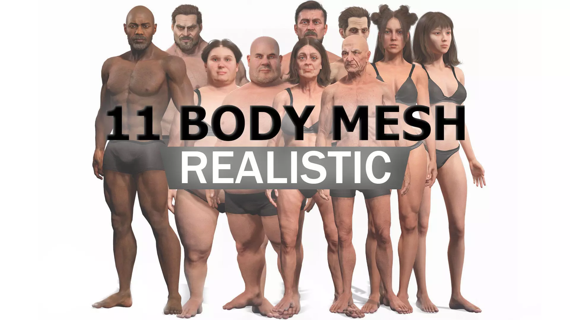 The 11 Body Mesh Realistic Pack includes a diverse collection of highly detailed male and female 3D body models, ideal for realistic projects in gaming, animation, and cinematics. Designed with accurate human anatomy, varied body types, ages, and proportions, this set is perfect for adding authenticity and diversity to your scenes.