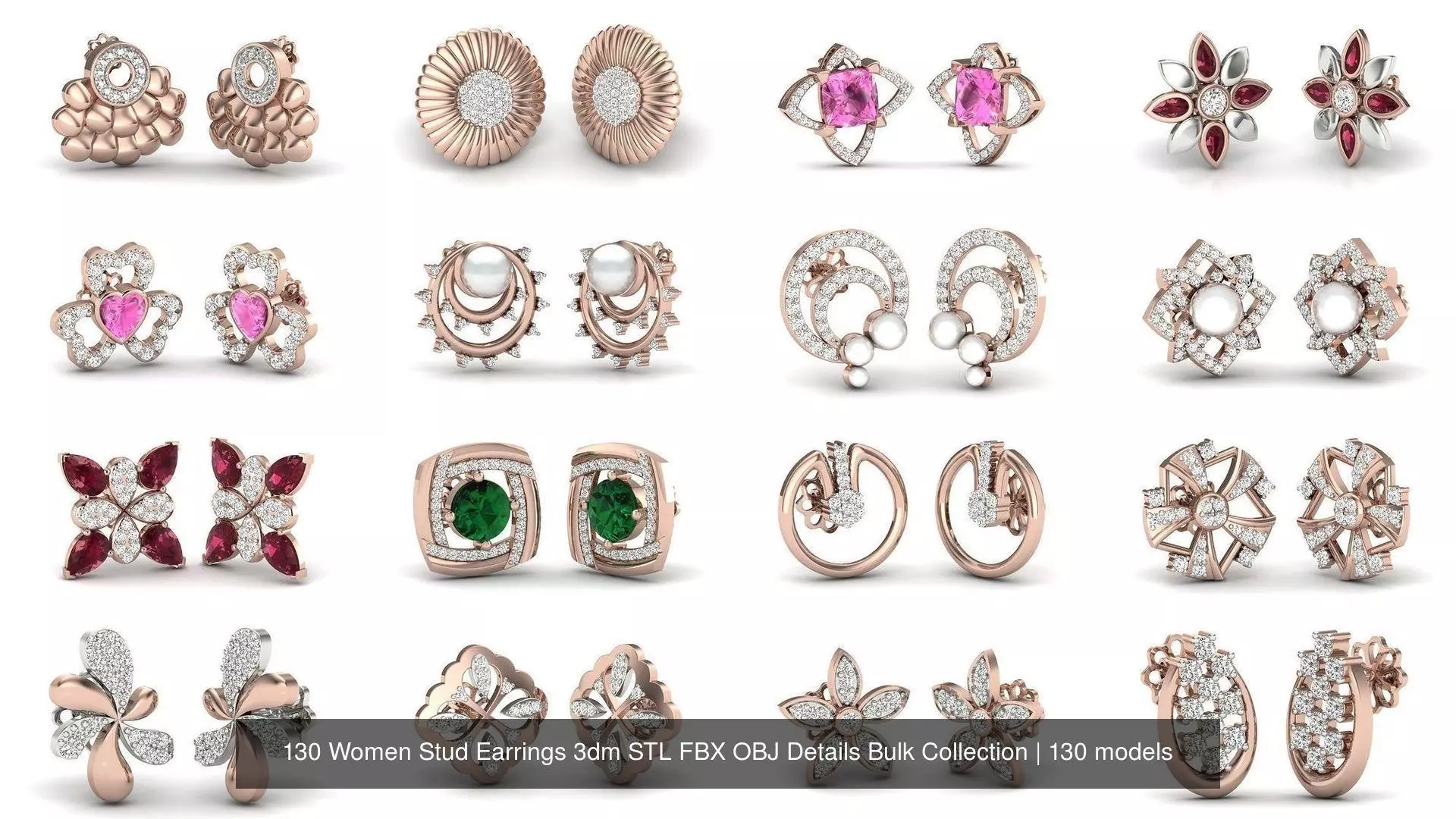 130 Women Stud Earrings 3dm STL FBX OBJ Details Bulk Collection 3D Model Pack
