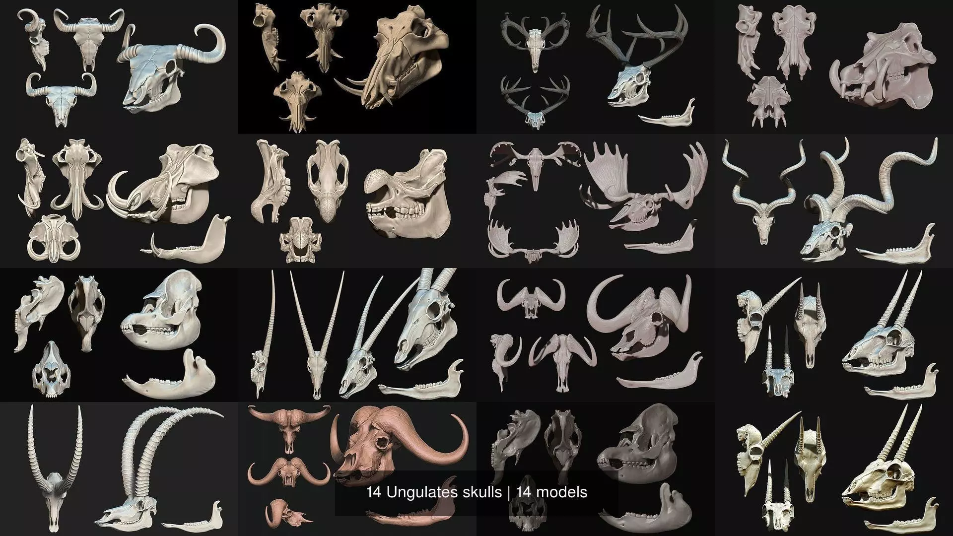 It includes 14 models of skulls, all of them from animals of the superorder Ungulates.