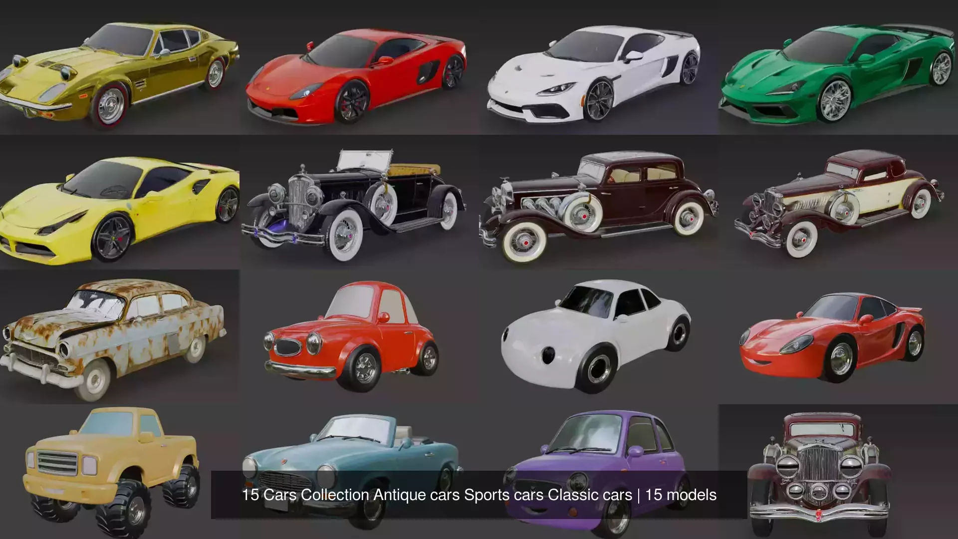 15 Cars Collections of Antique cars, Sports cars, Cartoon cars, Classic cars, Old carsfile formats - fbx, obj, stl, glb, usdz