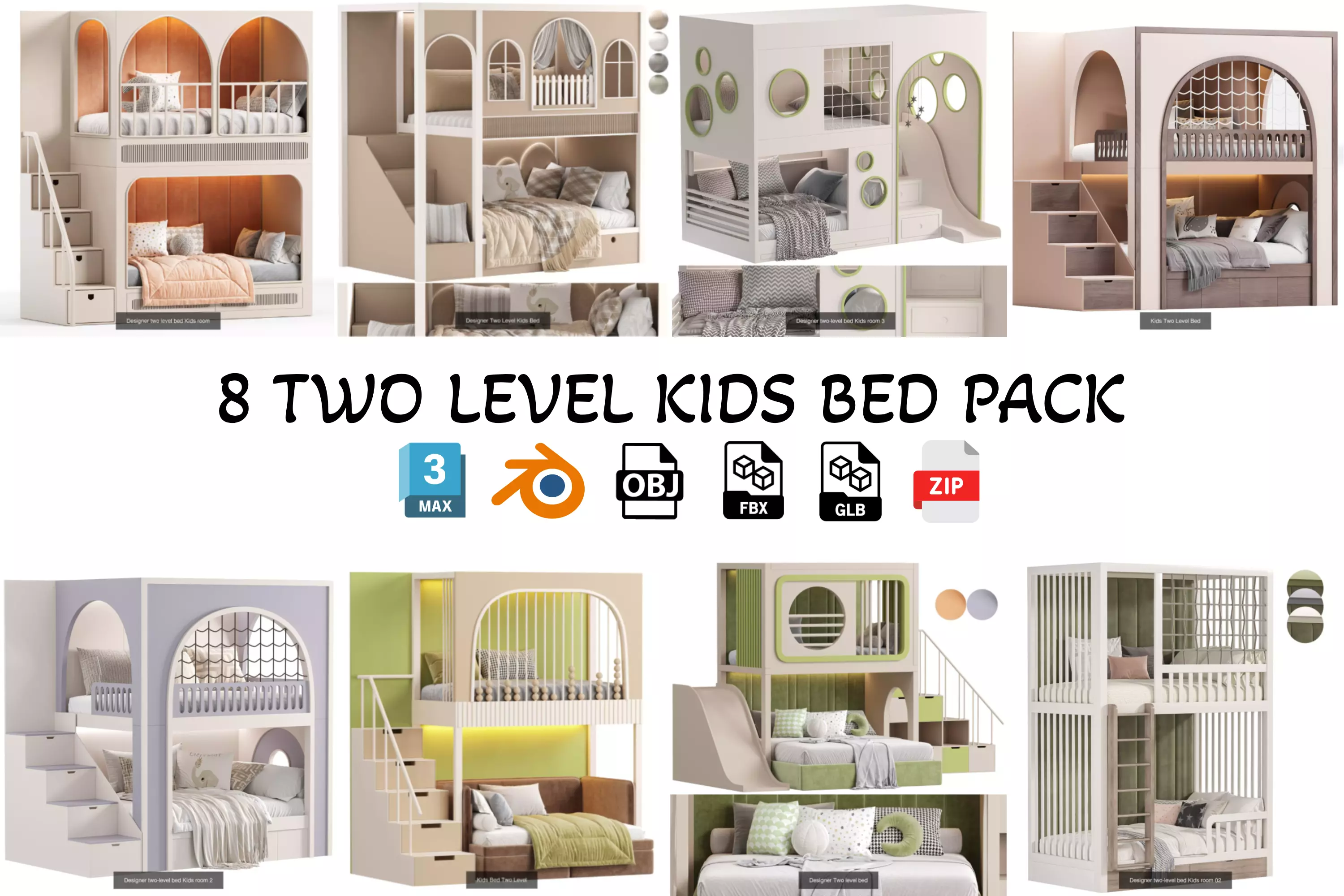 2 level Kids Bed packHigh quality textured 3d bed models.Software: native 3DsMax. other formats: Blend, Fbx, Obj, Glb, Abc, Dae...Topology: Quad basedPerfect for using interiors.
