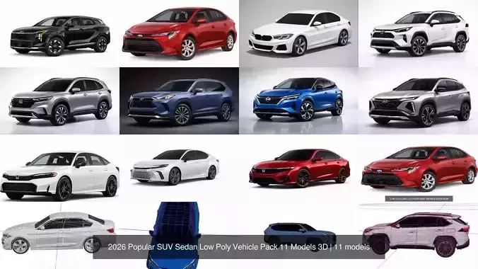 This 2026 popular SUV and sedan low poly vehicle pack 3D model collection includes 11 optimized models, representing the most preferred modern vehicle types for urban environments.The pack combines a balanced selection of modern SUVs and sedans, making it ideal for realistic traffic systems and city scenes.