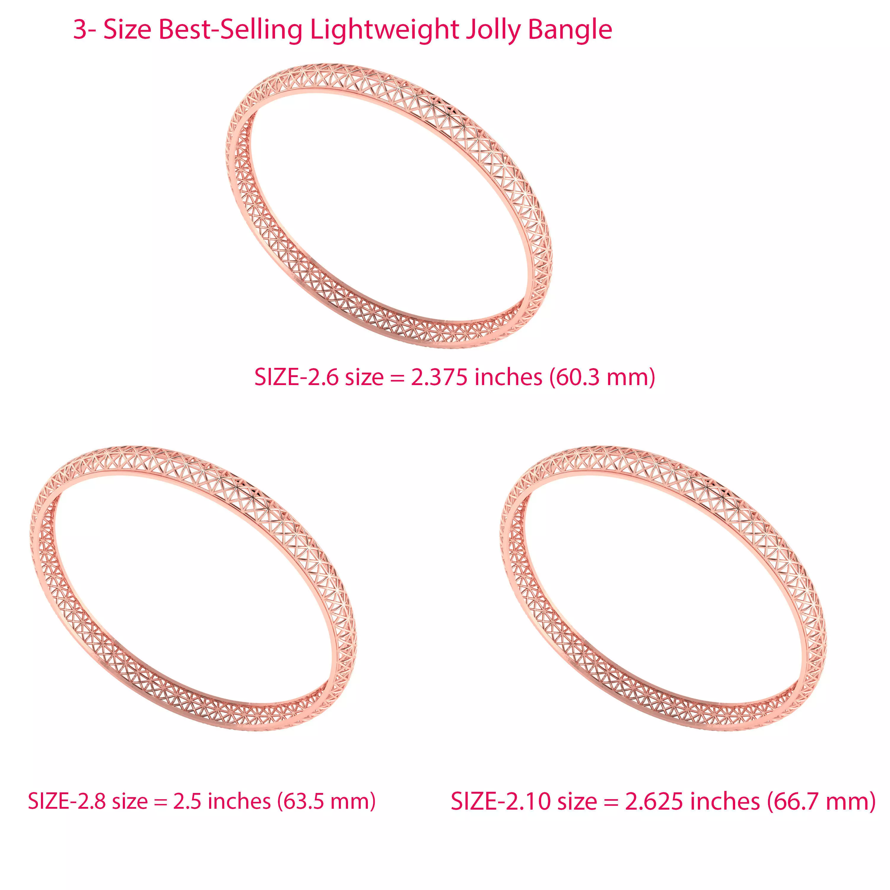 Shine every day with our Best-Selling Lightweight Jolly Bangle, designed for women who love style without the extra weight. Crafted with precision, this elegant bangle combines durability with a sleek, modern look. Its lightweight design makes it comfortable for long wear, while the intricate detailing adds a touch of sophistication to any outfit. Perfect for daily wear, festive occasions, or as a thoughtful gift, this top-selling jolly bangle is a must-have in every jewelry collection.