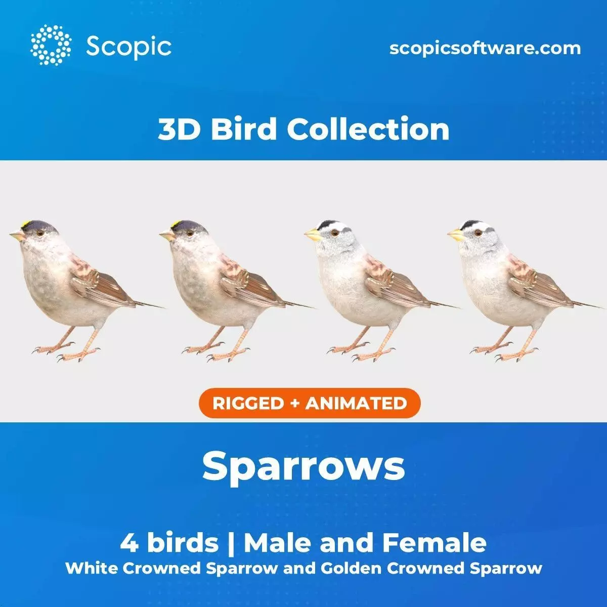 Animated 3D Collection of Sparrows, including one pair of the White Crowned Sparrow and one of the Golden Crowned Sparrow. The models are rigged in Maya and include various modular animations, perfect for creating custom scenes with ease. You can find both male and female textures included as well as folded and unfolded wing poses. The textures were created with great attention to detail, providing you with accurate and realistic 3D bird models.