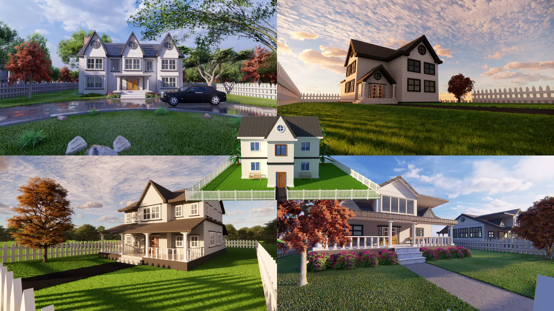 3D Villa 5 Model: Made with Sketchup 2018. Rendered with Enscape. Extensions : .fbx - .3ds - .stl - .dae - .obj - .skp - .dwg. 8 different colored villas in one. - Polygons: 20,343