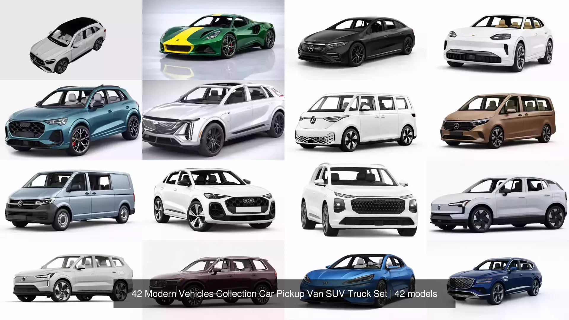 Collection of 42 modern vehicle models including cars, pickup trucks, vans, SUVs and various transport vehicles. The set is designed for city traffic scenes, urban environments and large vehicle libraries.