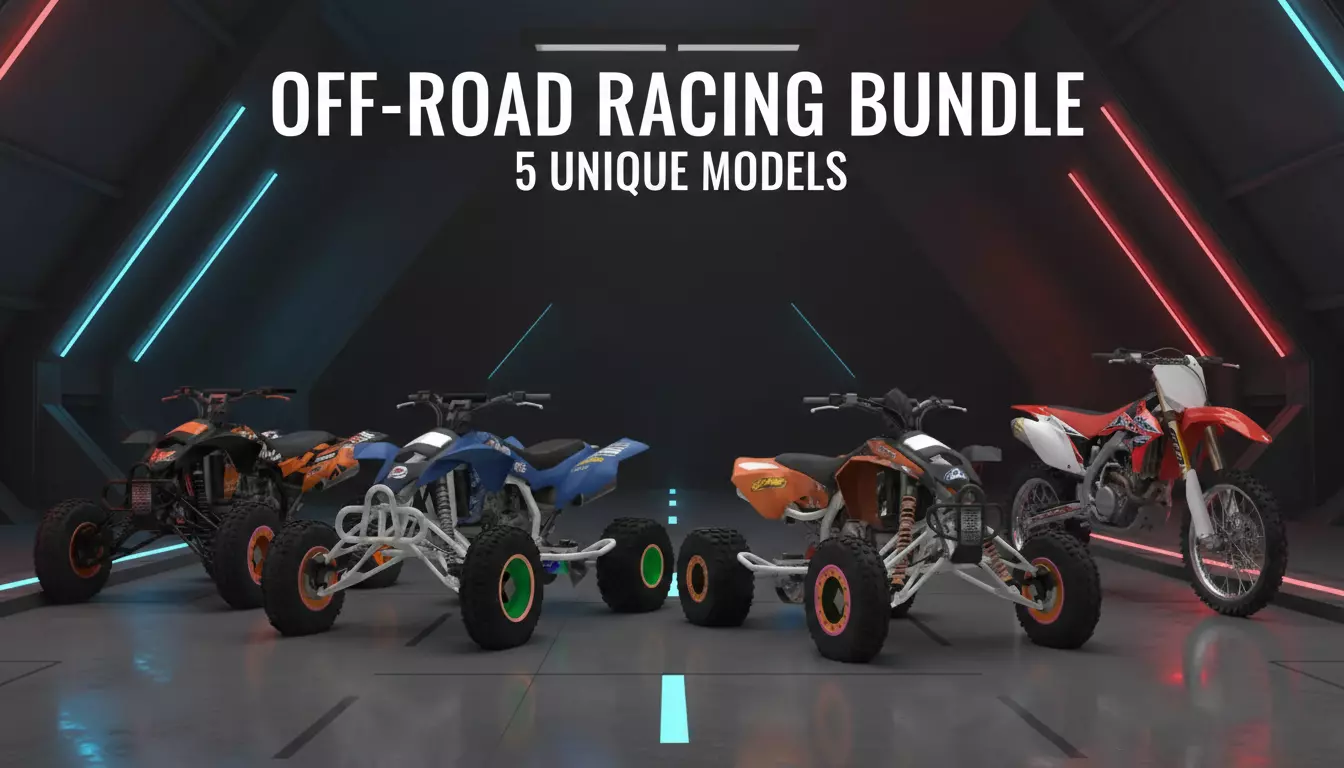 Conquer the dirt with this premium 450cc off-road bike bundle. Features five high-performance motocross and enduro motorcycles, including competition models and custom designs, each meticulously detailed with off-road configurations for racing games, simulations, and motorcycle projects.