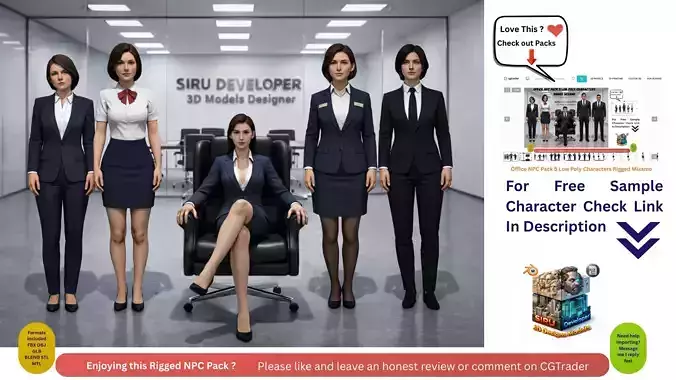 This pack includes five high quality female office NPC characters, designed for games, simulations, training software, and real time applications. Each character represents a professional office or business role, suitable for corporate, modern city, and workplace environments.