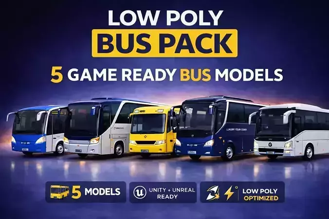 This Low Poly Bus Pack includes 5 high-quality, game-ready bus models, designed for games, simulations, mobile apps, VR/AR, and real-time projects.All models are optimized for performance while maintaining clean geometry and realistic proportions. Ideal for city transport systems, traffic simulations, racing games, and urban environments.What’s Included5 different low poly bus modelsCity BusLuxury Tour CoachSchool BusModern Transport BusesClean UVs and optimized topologyGame ReadyLow poly & performance optimizedSuitable for mobile, PC, and consoleEasy to customize materials and colorsThis Low Poly Bus Pack includes 5 high-quality, game-ready bus models, designed for games, simulations, mobile apps, VR/AR, and real-time projects.All models are optimized for performance while maintaining clean geometry and realistic proportions. Ideal for city transport systems, traffic simulations, racing games, and urban environments.What’s Included5 different low poly bus modelsCity BusLuxury Tour CoachSchool BusModern Transport BusesClean UVs and optimized topology Game ReadyLow poly & performance optimizedSuitable for mobile, PC, and consoleEasy to customize materials and colorsFile FormatsFBXOBJBLEND (Blender native) Software CompatibilityBlenderUnityUnreal EngineCinema 4DMaya3ds MaxAny engine supporting FBX/OBJFBXOBJBLEND (Blender native) Software CompatibilityBlenderUnityUnreal EngineCinema 4DMaya3ds MaxAny engine supporting FBX/OBJ
