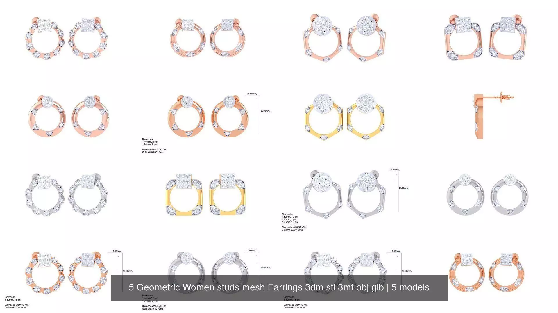 5 Geometric Women studs mesh Earrings 3dm stl 3mf obj glb 3D Model Pack
