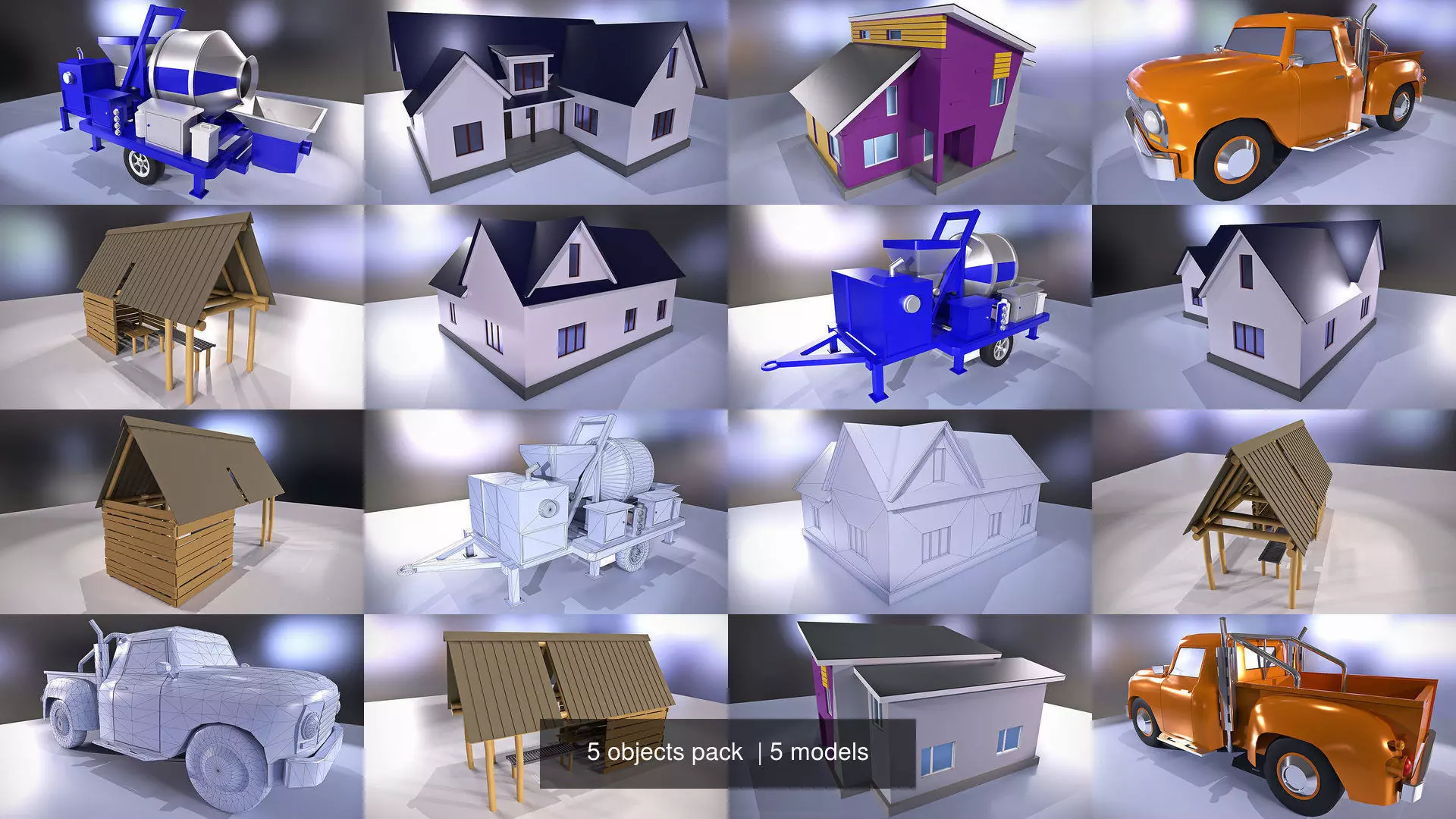 The low-poly 3D models pack of 5 objects includes two cottages, a sawmill, a concrete mixer and a pickup truck. The 3D models can be used in hypercasual games and animation, as part of the general game environment or background of game levels.