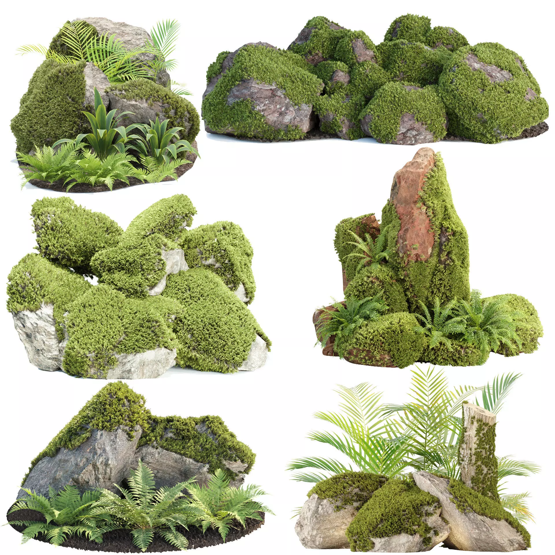 This bundle delivers a complete set of natural assets, featuring 34 highly detailed rocks with forest moss, 14 diverse fern models, one cut tree trunk, and three palm plants. All models are fully UV-mapped, optimized, and ready for use in architectural visualization, environment design, and game development.Created with a focus on realism and variety, this collection is ideal for building natural scenes in any style.