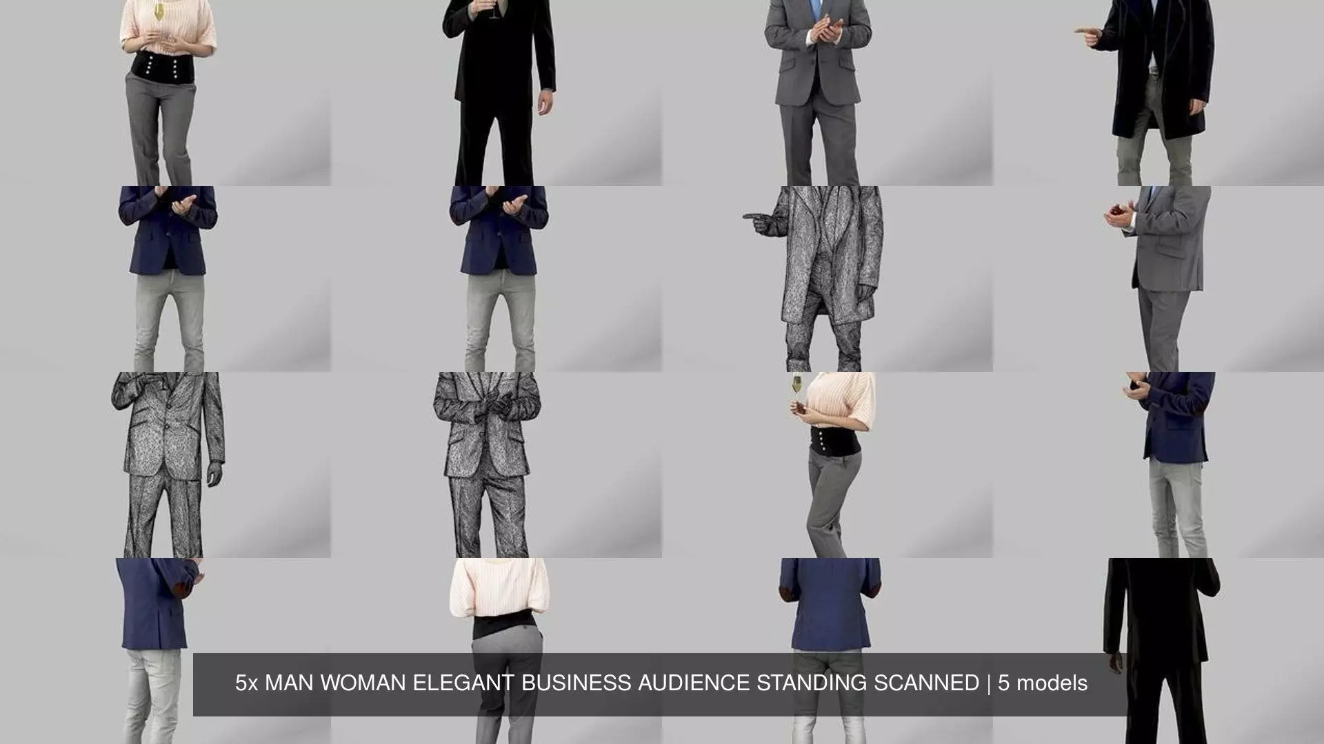 5x MAN WOMAN ELEGANT BUSINESS AUDIENCE STANDING SCANNED 3D Model Pack