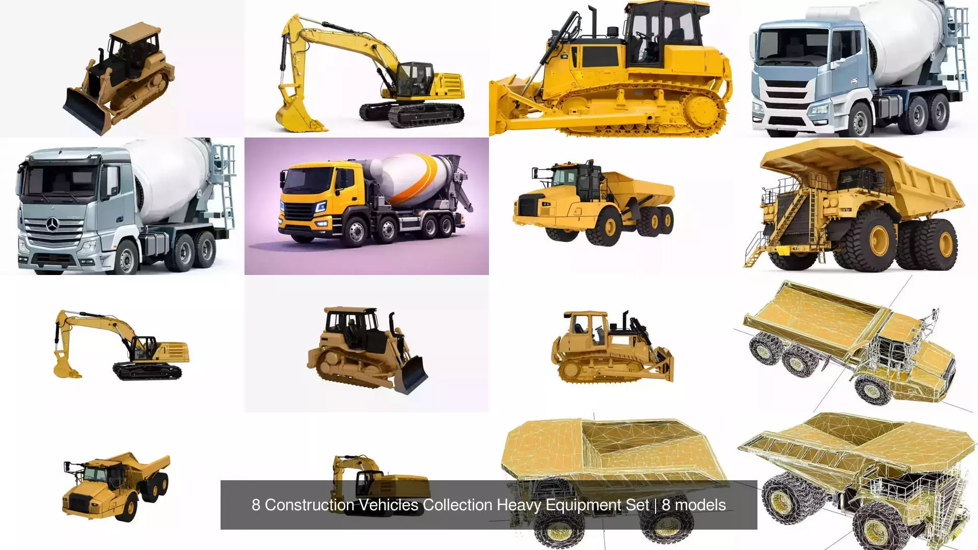 Collection of 8 construction vehicle models designed for industrial, building and heavy equipment environments. The set includes a variety of machines suitable for construction sites, infrastructure projects and engineering scenes.