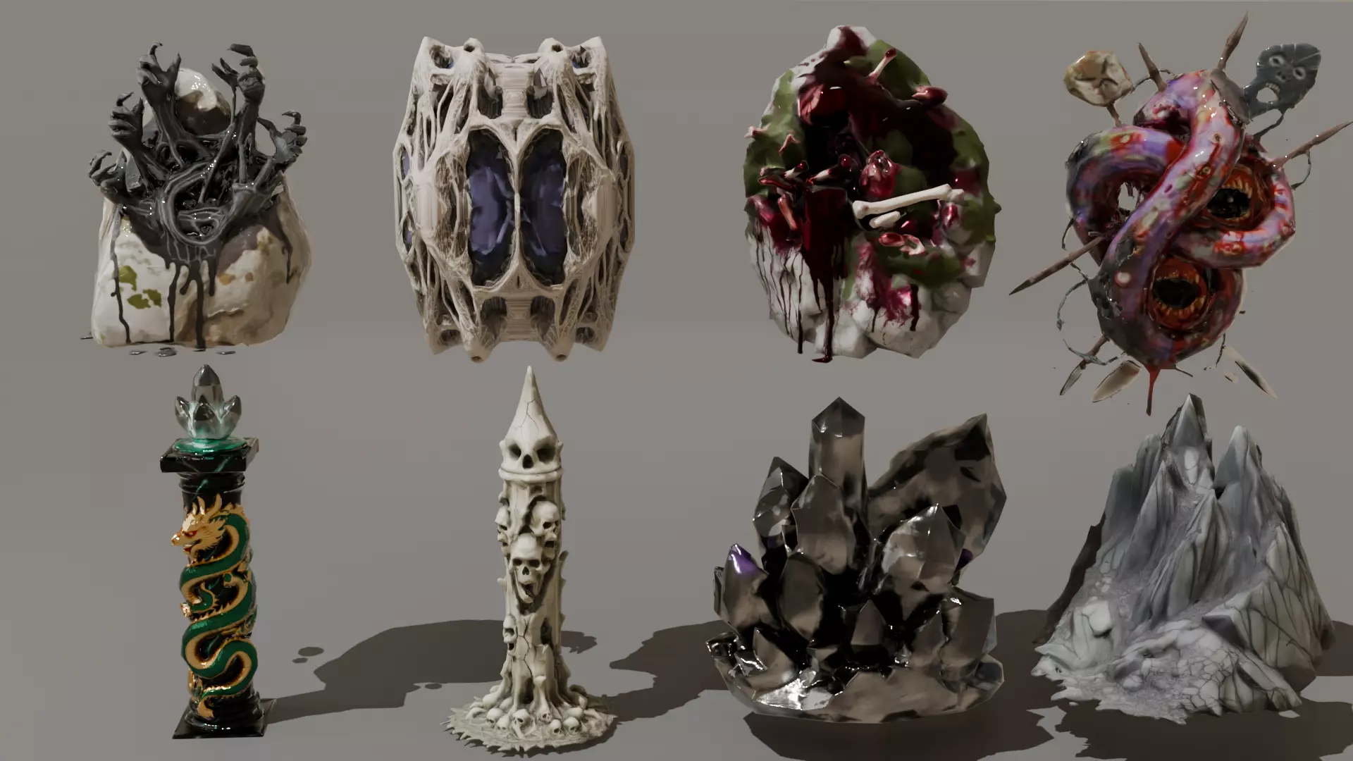 Included Assets:• Skull Obelisk Monument• Diseased Horror Rock• Relief Rock Formation• Corrupted Fantasy Rock• Crystal Rock Formation• Hand Shape Rock Sculpture• Dragon Column Monument• Amorphic Anomaly Prop