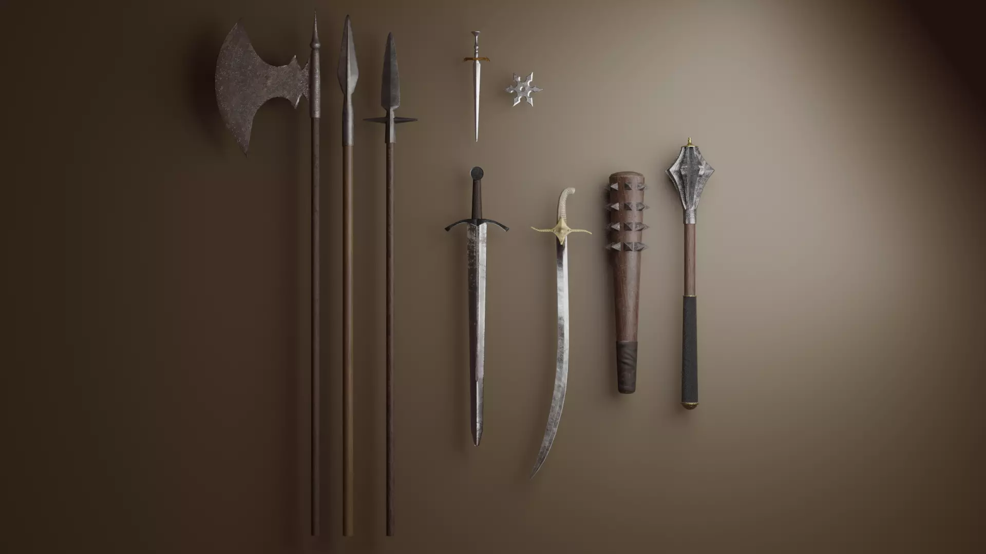 Nine models of medieval weapons (fbx. and obj. model format) modeled in Blender and textured in Substance Painter.