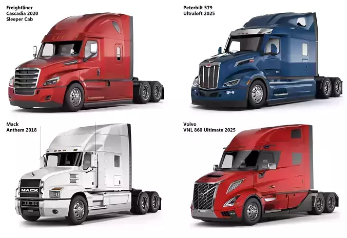 A collection of modern long-haul truck tractors. The set includes: Freightliner Cascadia 2020 Sleeper Cab, Peterbilt 579 Ultraloft 2025, Anthem 2018, Volvo VNL 860 Ultimate 2025. Key components are prepared for TurboSmooth (Iteration 2). Body components and wheels have been refined. The interior is preliminary.
