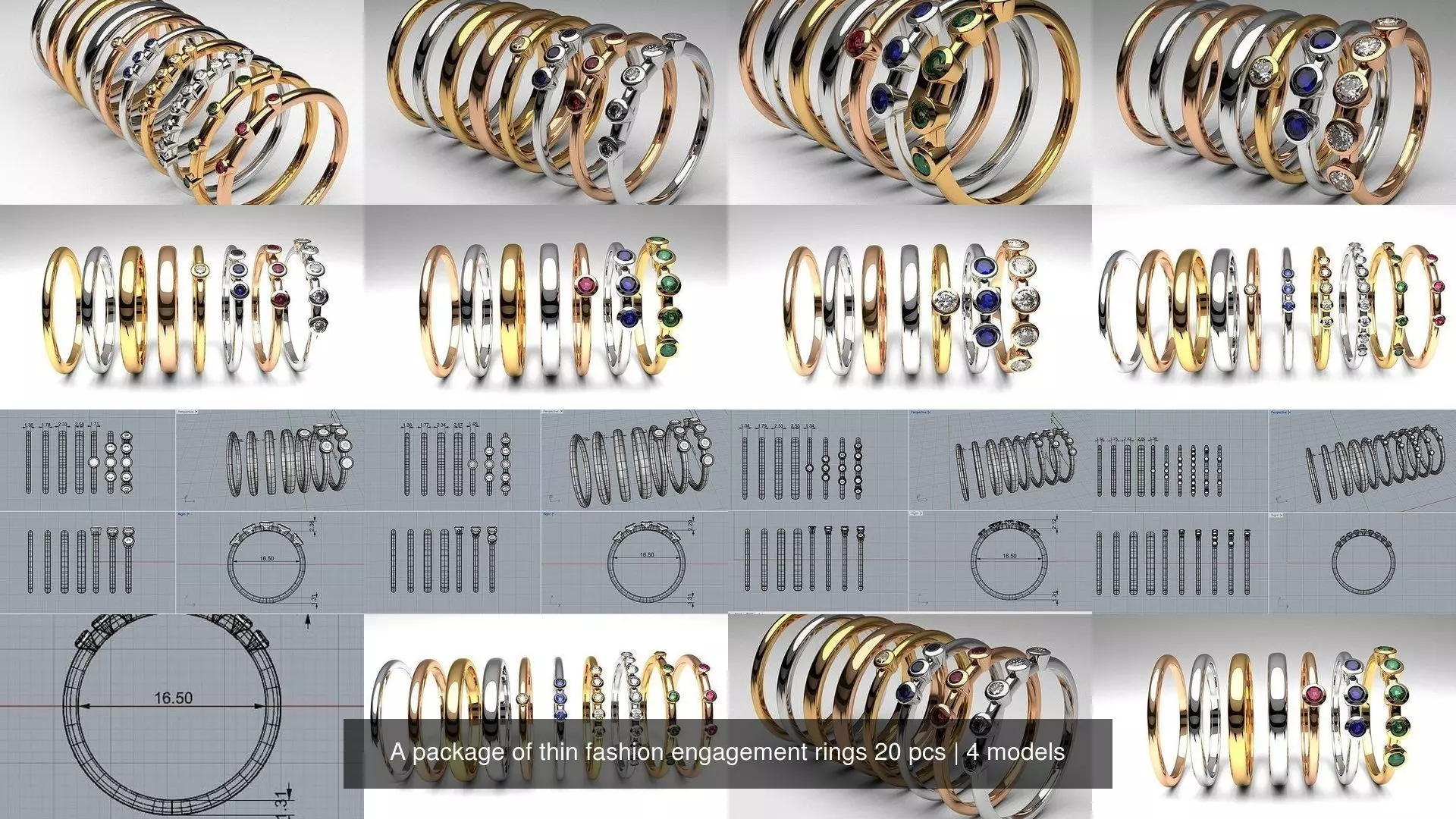 In each set the first 4 classic ring bands are the same so the different rings count is only 20Rings size in milimeters: 16,5mmStones size in mm: 1,25mm;2mm;2,5mm;3mmBeautiful thin rings set for golg, silver, platinum casting! It will look spectacular with high quality diamonds, sapphires, rubies, emeralds or other gemstones!It is universal rings, these rings can be used as engagement, stasement, anniversary, wedding bands, every day use rings!My models are made for 3d printing on sla lcd 3d printer!Model can be used for the wax model, and production. NO TEXTURES AND MATERIALS.After printing the model can be used as a plastic examle for your customer. Also You can make a silicone mold for wax injecting and casting in metal.If have any questions text me, I will answer you as soon as I can!Check out other of my 3d models, maybe you will find some more usefull models! Feel free to post your recomendations or critics for me in comments below!I will be thankfull For any coments because it will help me grow faster!If my model was helpfull to you I will be wery thankfull if you leave a review to me!This is what I need for my store to grow and for me to be able to make more 3D models that would be useful to you!