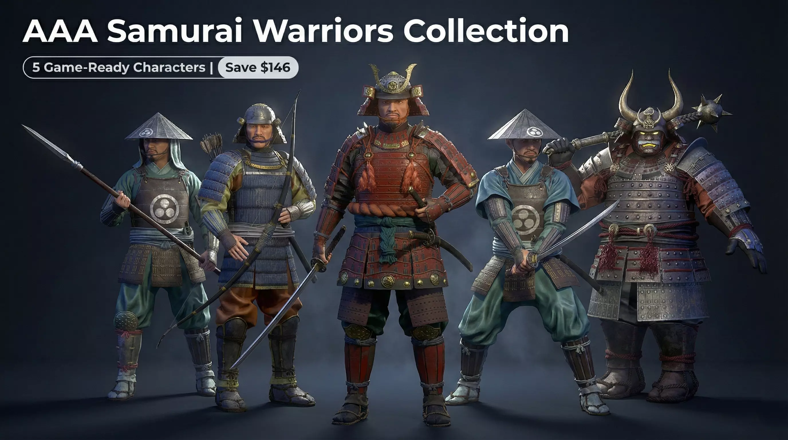 The AAA Samurai Warriors Collection includes 5 high-quality, game-ready samurai characters, designed for real-time applications such as games, VR/AR experiences, cinematics, and simulations. Each character is carefully crafted with optimized low-poly topology and detailed PBR textures, delivering an excellent balance between visual quality and performance.