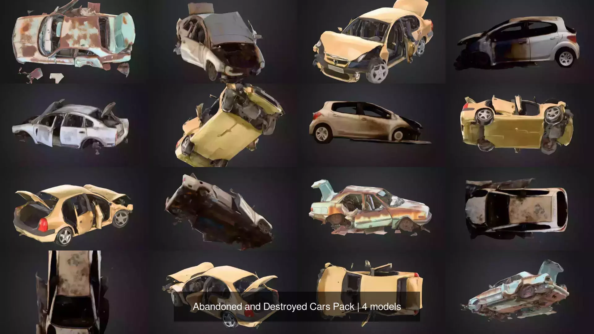 The Abandoned & Destroyed Cars Pack is a comprehensive collection of highly detailed 3D vehicle assets that bring realism, decay, and storytelling into your environments. This set includes a variety of rusty junk cars and a completely burned vehicle, each crafted to represent the harsh passage of time, destruction, and neglect.