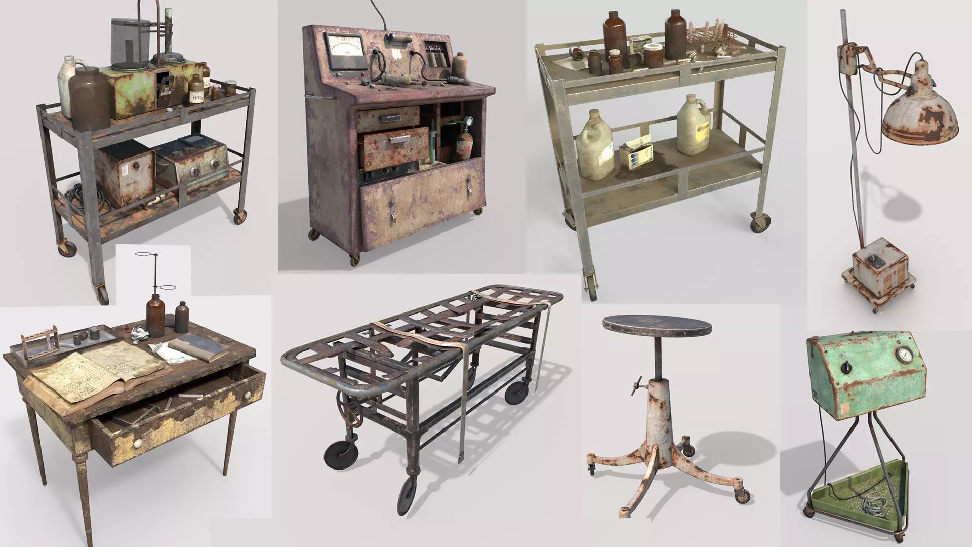 Model of Abandoned Sanatorium Equipments. Models are very realistic. All model's maps are PBR material.Maps are diffuse-specular-glossiness-height -opacity and normal. Opacity map is used for transparent materials. Also, PBR Metallic-Roughness ( Basecolor- Metallic- Normal-Roughness- Height and Opacity ) workflow has been added. Model's textures has two sizes; 4096x4096-2048x2048. All maps are PNG formats .