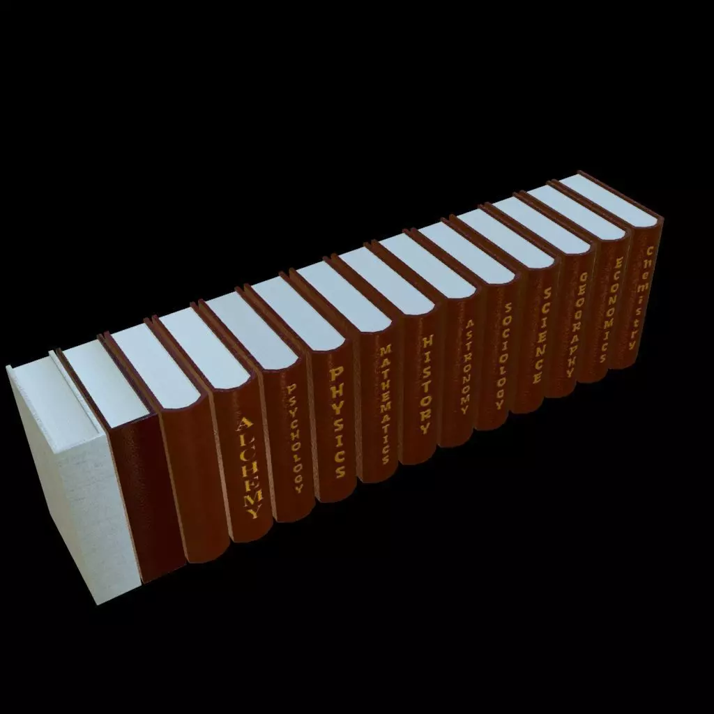 DescriptionThis 3D model collection features a full series of hardcover academic books arranged in a row, matching the reference image. The set consists of 14 books: 13 dark red/brown volumes and 1 white volume. Each book has a leather-style cover with gold embossed vertical spine titles representing different academic disciplines, including: Alchemy, Psychology, Physics, Mathematics, History, Astronomy, Sociology, Science, Geography, Economics, and other scholarly subjects visible in the set.