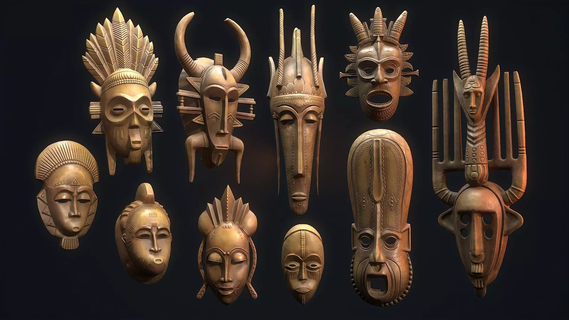 African екшифд mask collectioninclude hi quality low poly model for pbr,all mask has 2 Variant texture, wood light and paintedtexture res. 4k(albedo,metallic, roughness,ao,normal,rgb massk)3 Lod includecollision inludeformat inlude: *fbx *obj *max