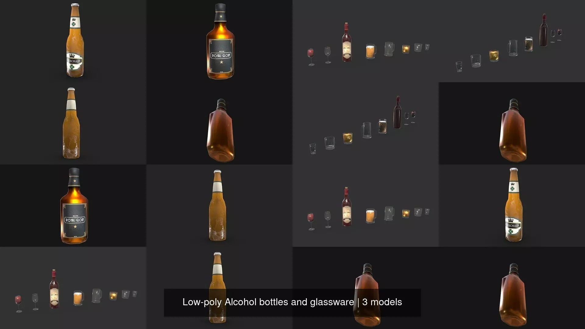 A low-poly collection including a wine bottle, whisky bottle, beer bottle, and multiple empty/full glassware.