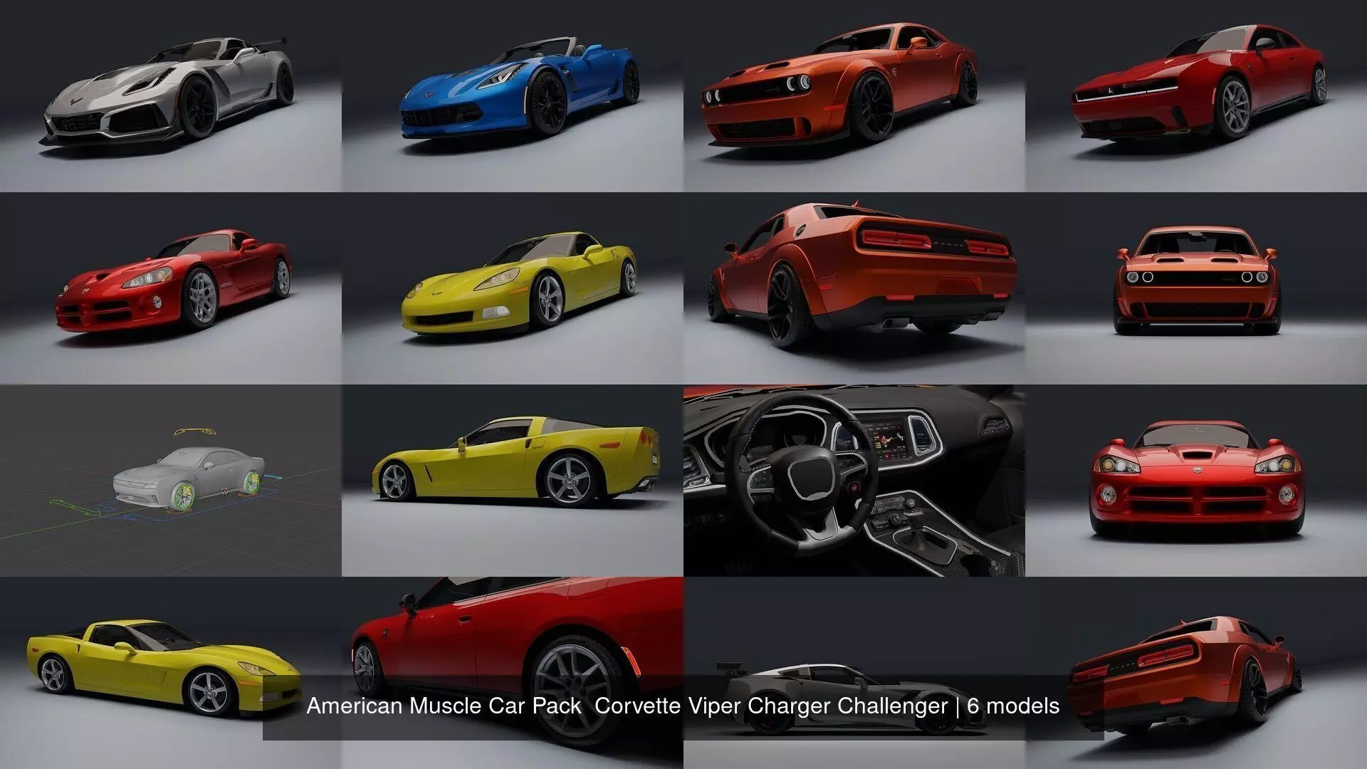 American Muscle Car Pack Corvette Viper Charger Challenger low-poly 3d model