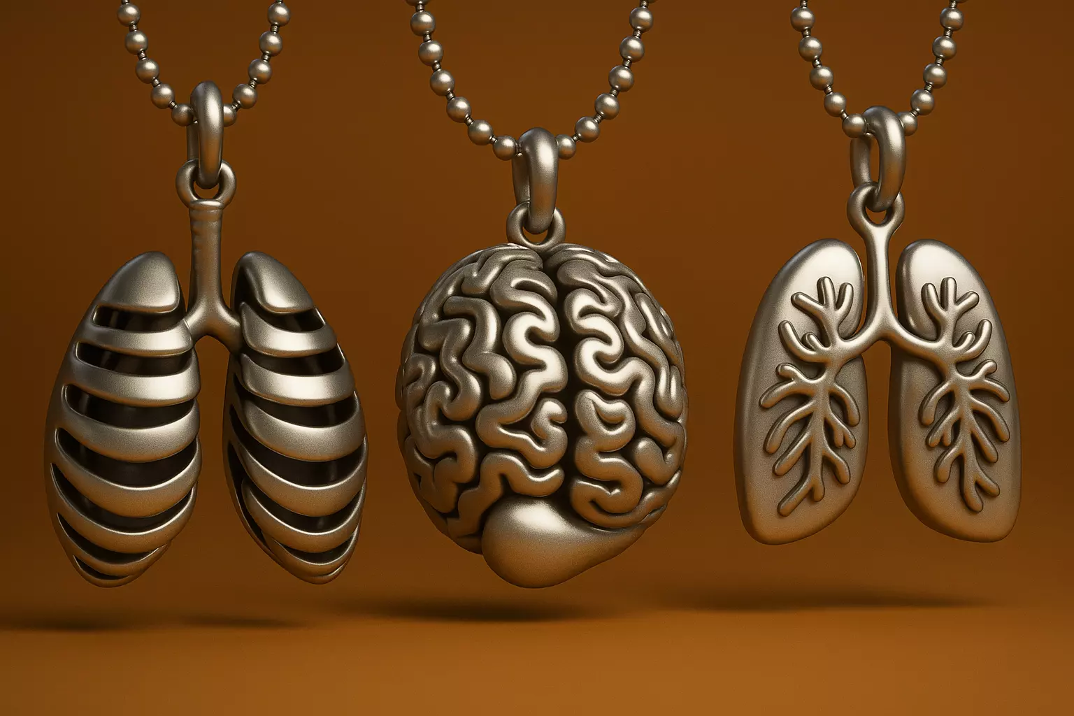 A sophisticated 3D models showcasing three distinct silver-toned anatomical pendants: a pair of rib-caged lungs, a highly detailed cerebral brain, and a stylized bronchial lung set. Suspended from elegant ball chains against a warm ochre background, this collection perfectly balances scientific accuracy with artistic flair, making it an ideal gift for neurologists, pulmonologists, and lovers of medical curiosities.
