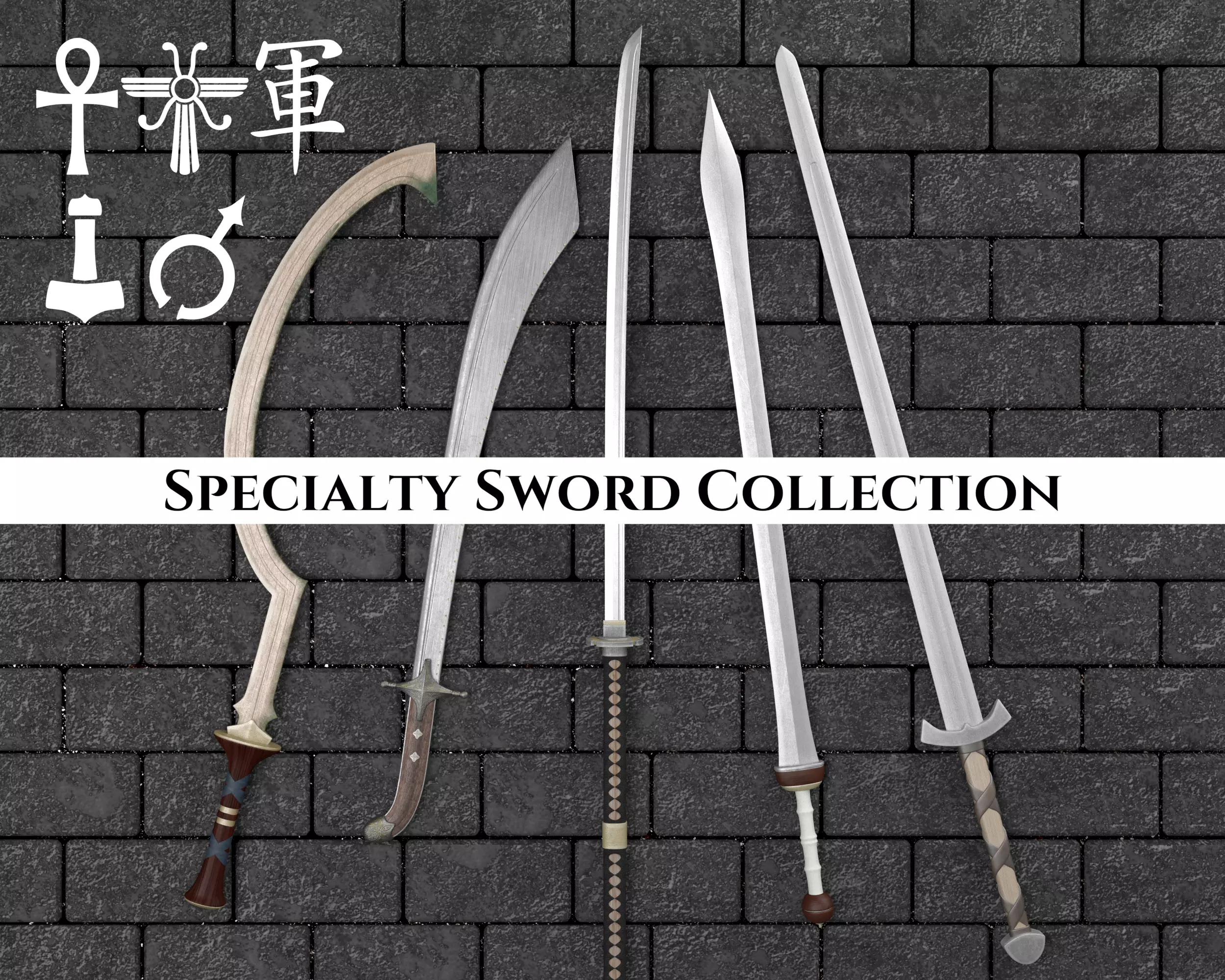 This Collection offers 5 unique Ancient Specialty Swords. Includes the Egyptian Khopesh, Indo-Persian Scimitar, Japanese Nagamaki, Roman Spatha, and Viking Greatsword. These models can be purchased separately. These models may be included in other collections for a different price.