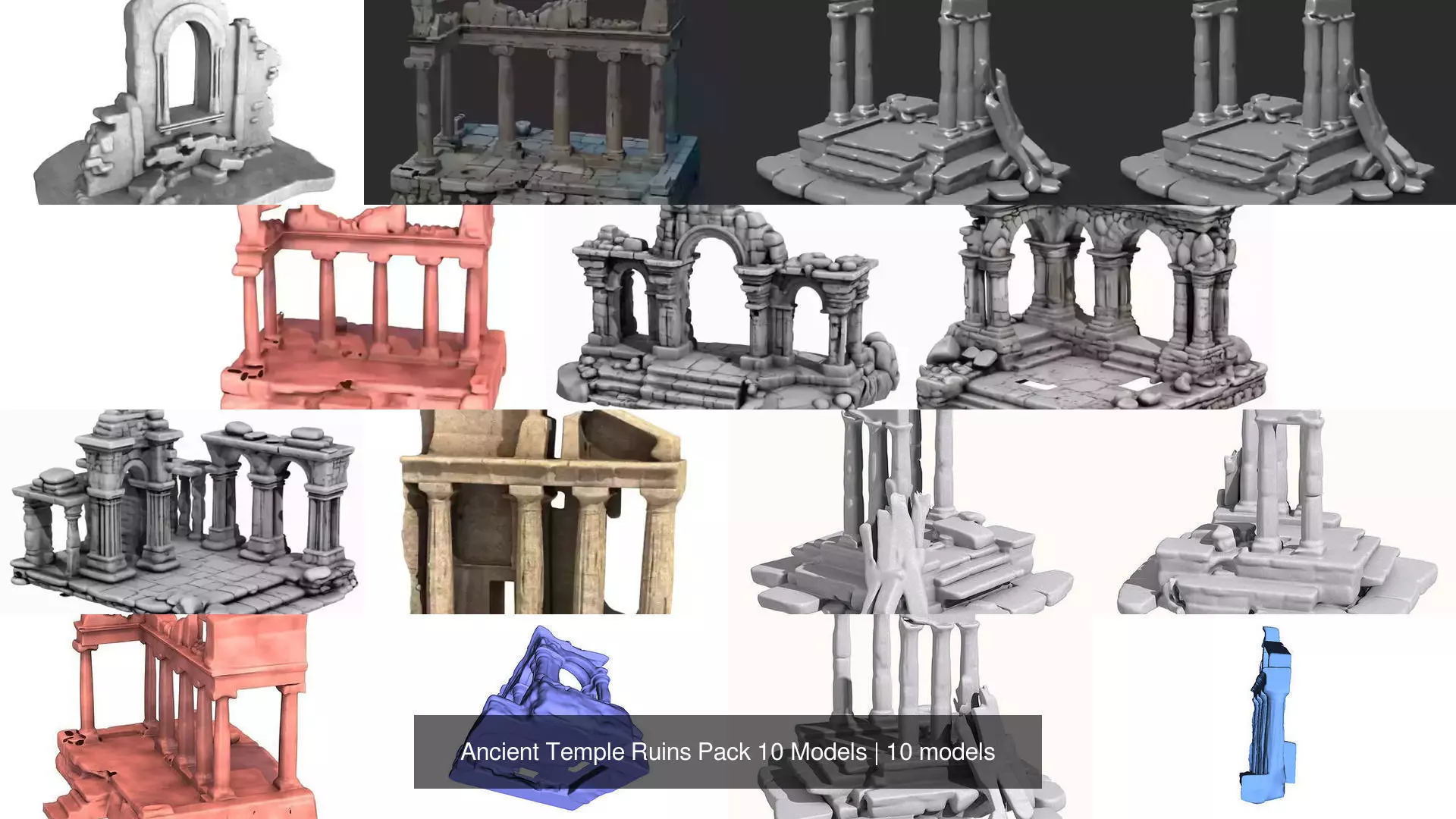 This pack includes 10 ancient ruins 3D models, perfect for creating historical or fantasy environments such as temples, roman ruins, forgotten cities, and dungeon scenes.