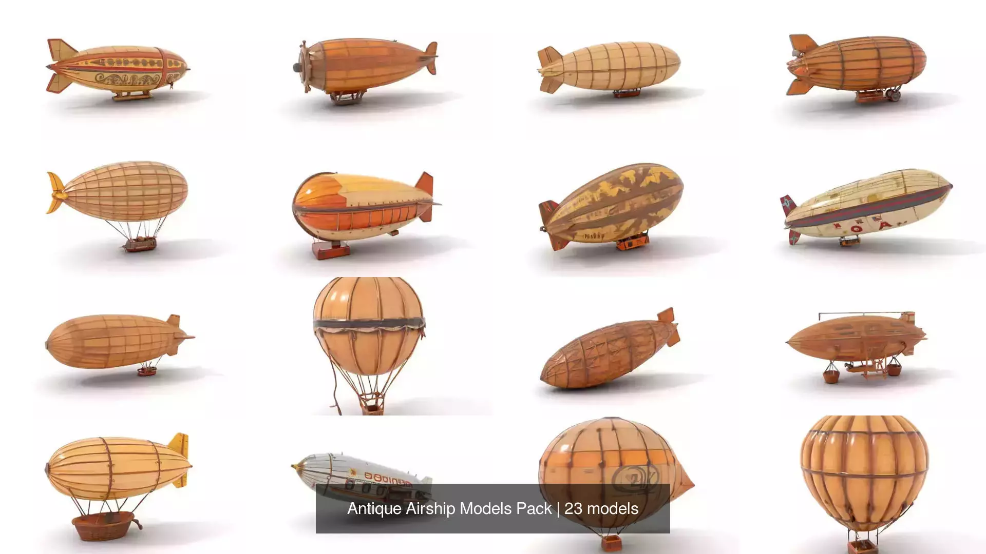 Explore the vintage charm of early aviation with the Antique Airship Models Pack. This collection features meticulously crafted 3D models that capture the intricacy and elegance of historical air travel. Delve into the world of antique blimps, classic dirigibles, and historic zeppelins, each portrayed in a side-view perspective to showcase their authentic design. From intricately patterned canopies and basketweave tops to ornate gondolas and weathered fabric textures, these models embody the pioneering spirit and artistry of bygone eras. Highlights include...
