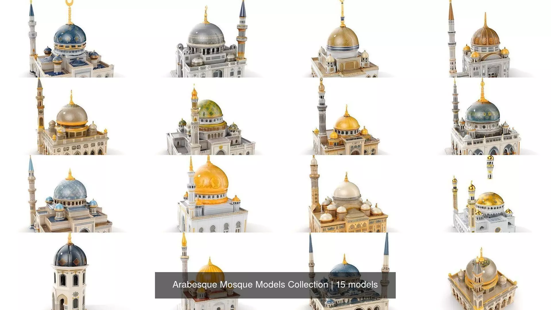 Explore a captivating collection of majestic mosque 3D models, each designed with artistic precision and deep cultural significance. This pack features elaborately detailed mosques complete with towering minarets topped with crescent finials and domes adorned in opulent gold accents. The richly textured surfaces exhibit intricate arabesque mosaics and geometric patterns, showcasing a vivid representation of cultural brilliance and architectural finesse. Perfect for architectural visualization, educational projects, or cultural displays, these models highlight the elegance and beauty of traditional mosque architecture with exceptional detail.