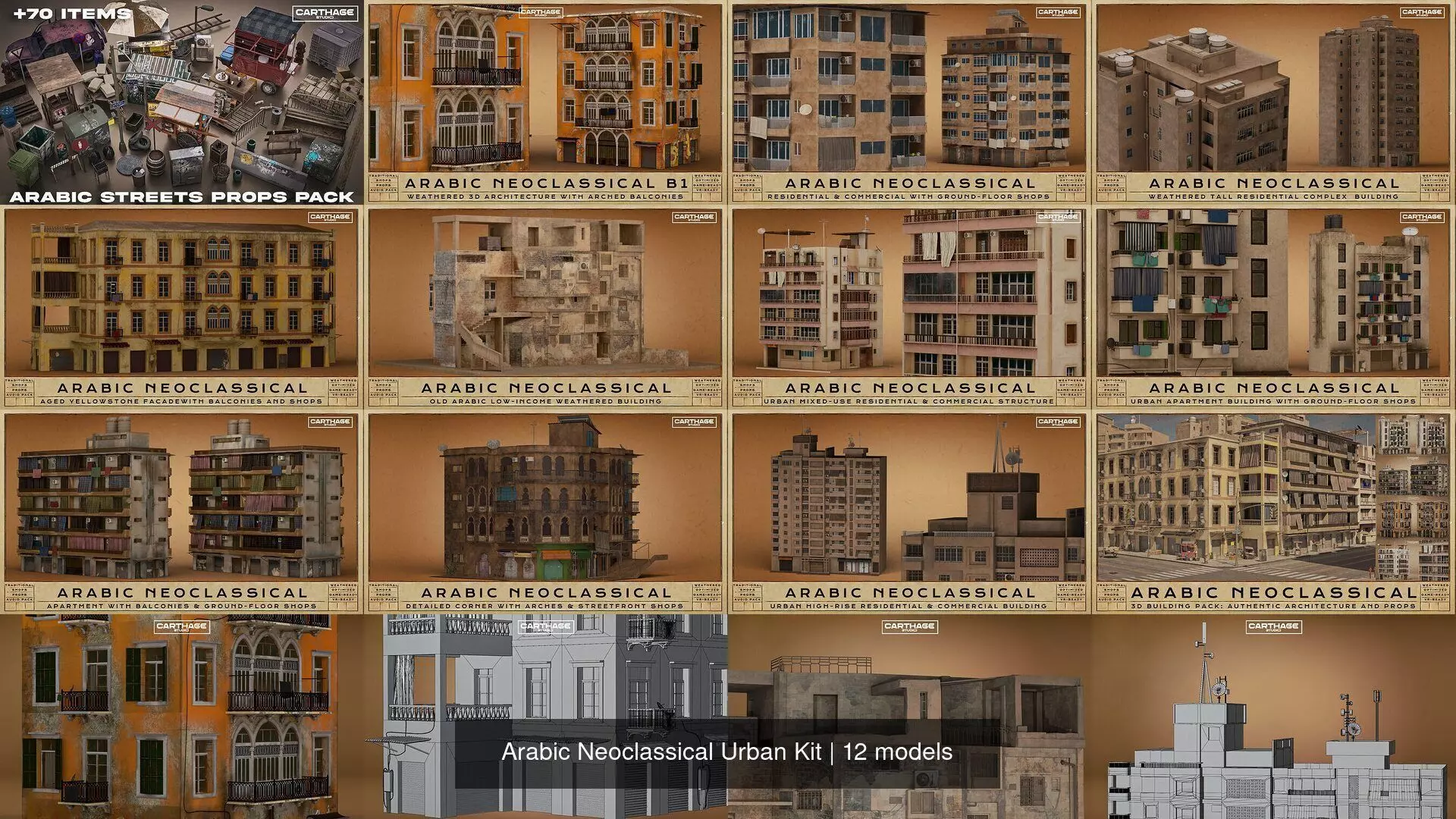 Build immersive Arabic cityscapes with 10 buildings, hundreds of props, and modular roads. High-quality assets designed for realism and cinematic flexibility.Not all assets are optimized for mobile or VR, some buildings feature high vertex counts and are intended for high-end desktop or cinematic use. However, everything is structured, cleanly modeled, and PBR textured, ensuring smooth performance across various production pipelines.