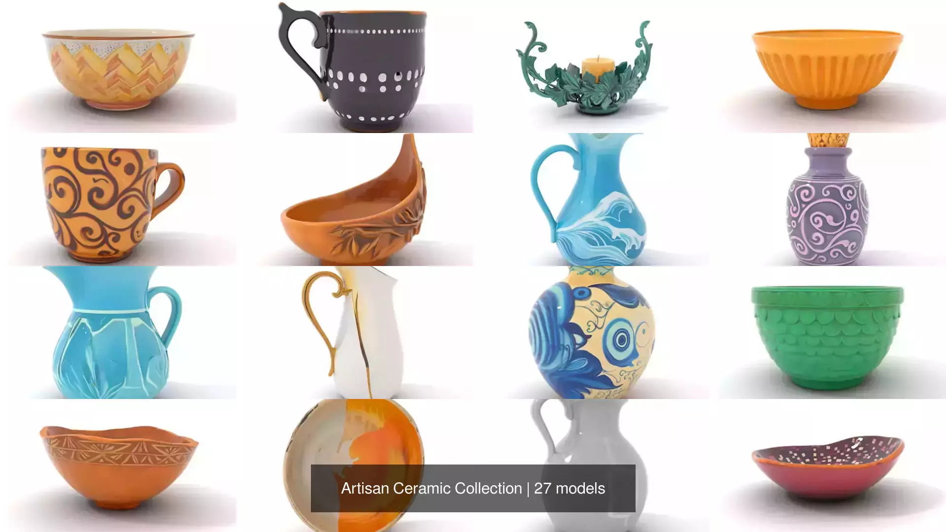 Whether drawn to fiery oranges, vibrant greens, or deep royal blues, this collection offers something for every taste in its carefully curated palette. Perfect for 3D modeling enthusiasts and art collectors alike, the Artisan Ceramic Collection is a digital treasure trove gleaming with creative potential.