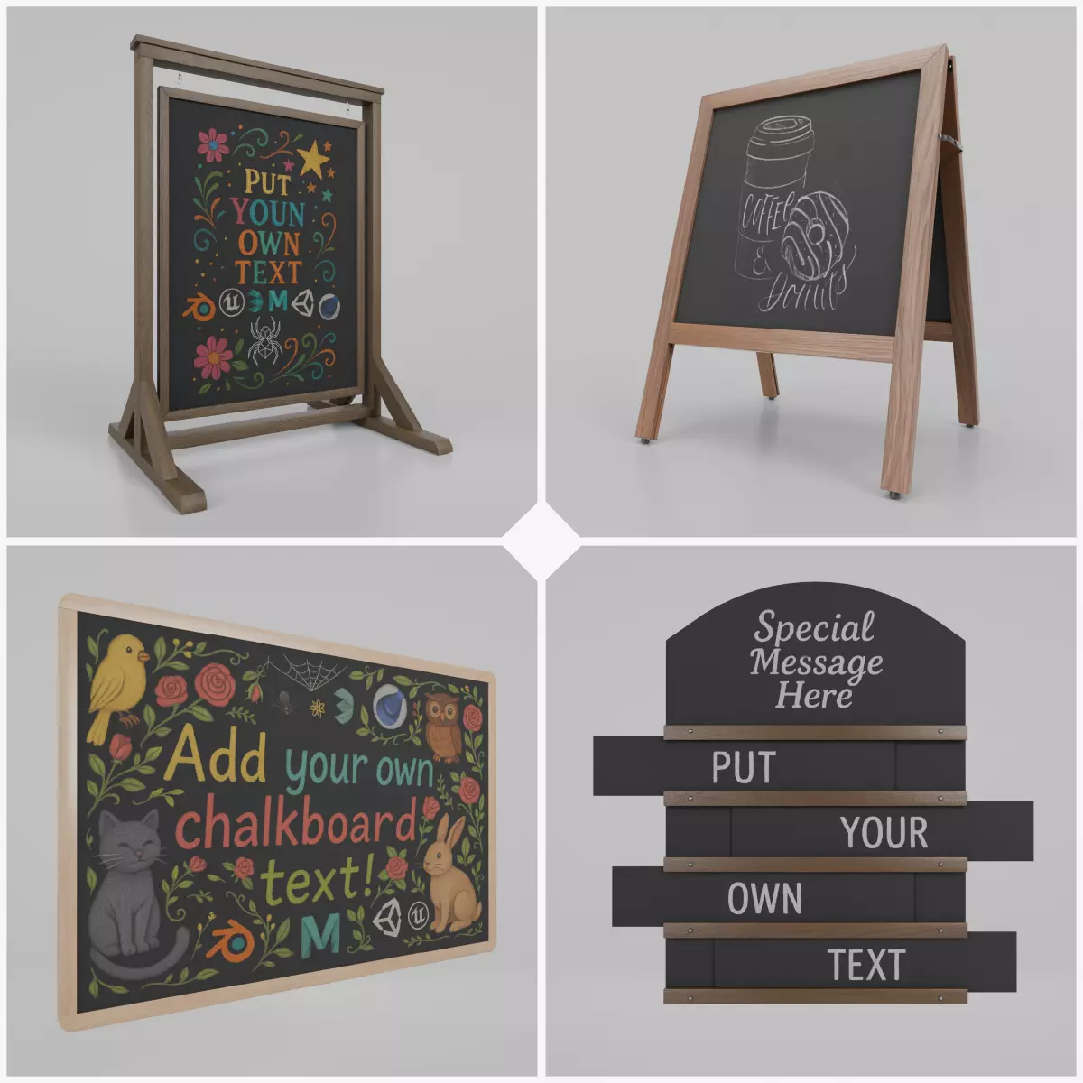 A professionally curated set of high-quality 3D chalkboard assets, combining four customizable sidewalk signs, countertop displays, and wall-mounted boards. Designed for architects, game developers, and 3D artists creating realistic commercial, educational, or hospitality environments.
