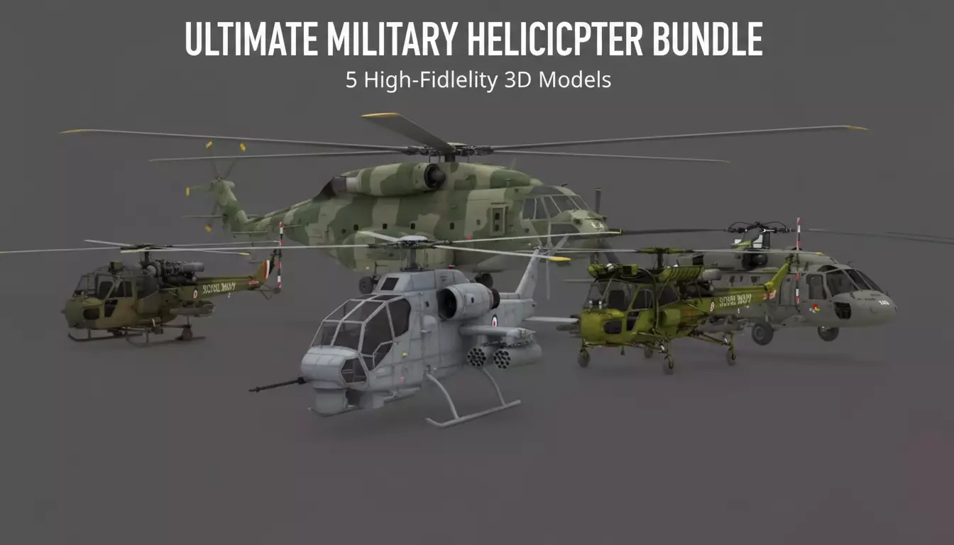 Command the skies with this premium helicopter bundle. Features five versatile rotary-wing aircraft spanning attack, transport, and naval roles, each meticulously detailed with authentic configurations for flight simulators, military games, and aviation projects.