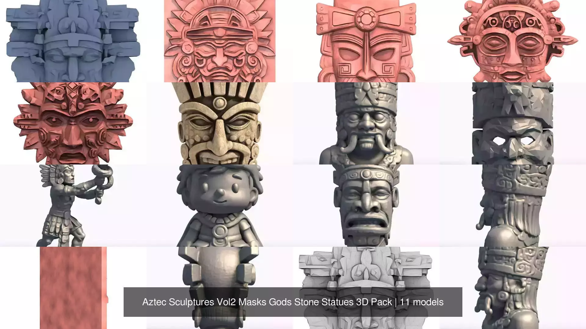 This pack contains 11 Aztec-inspired 3D models, featuring masks, gods, busts, skulls, and stylized stone sculptures, inspired by ancient Mesoamerican and Aztec mythology.