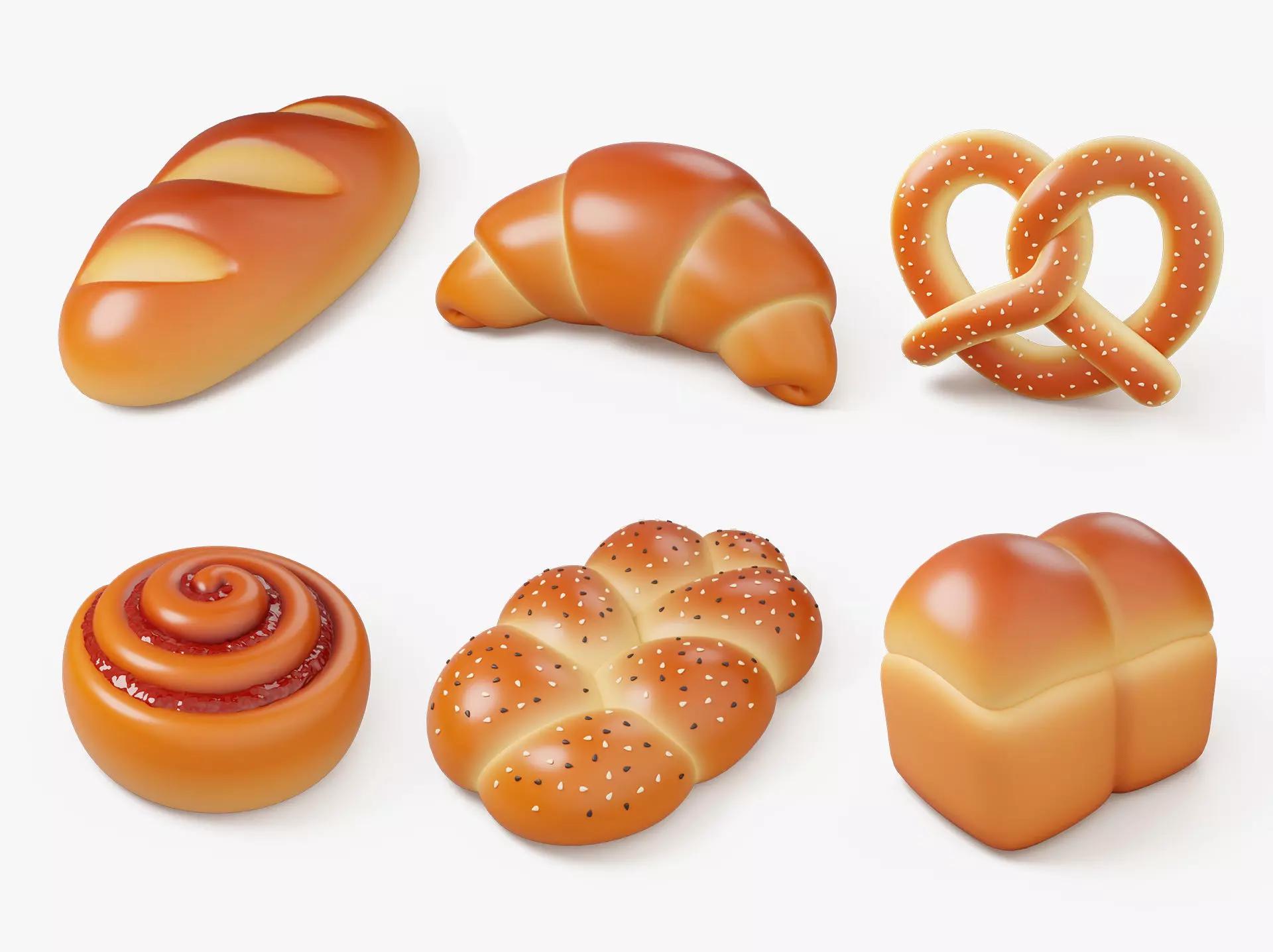 A delicious collection of stylized 3D bread and bun icons featuring classic bakery favorites: baguette, croissant, pretzel, cinnamon roll, braided sesame bun, and soft loaf. Each item is designed in a clean, glossy cartoon style, perfect for use in food apps, mobile games, bakery branding, UI/UX icons, and children’s content. This cohesive pack adds warmth and charm to any visual project.