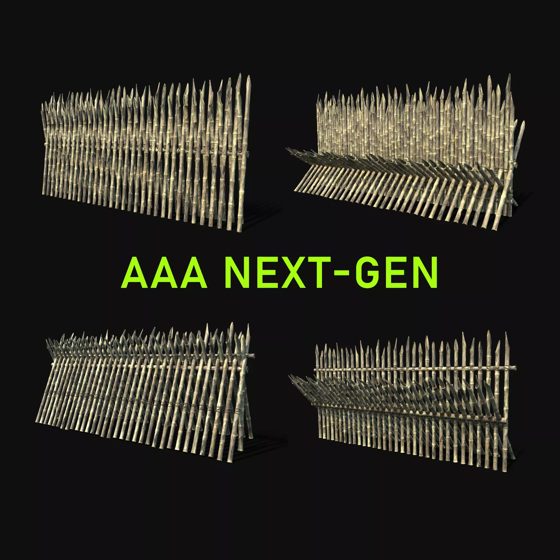 - Next gen, AAA quality, 4 game-ready models of generic bamboo palisades.
