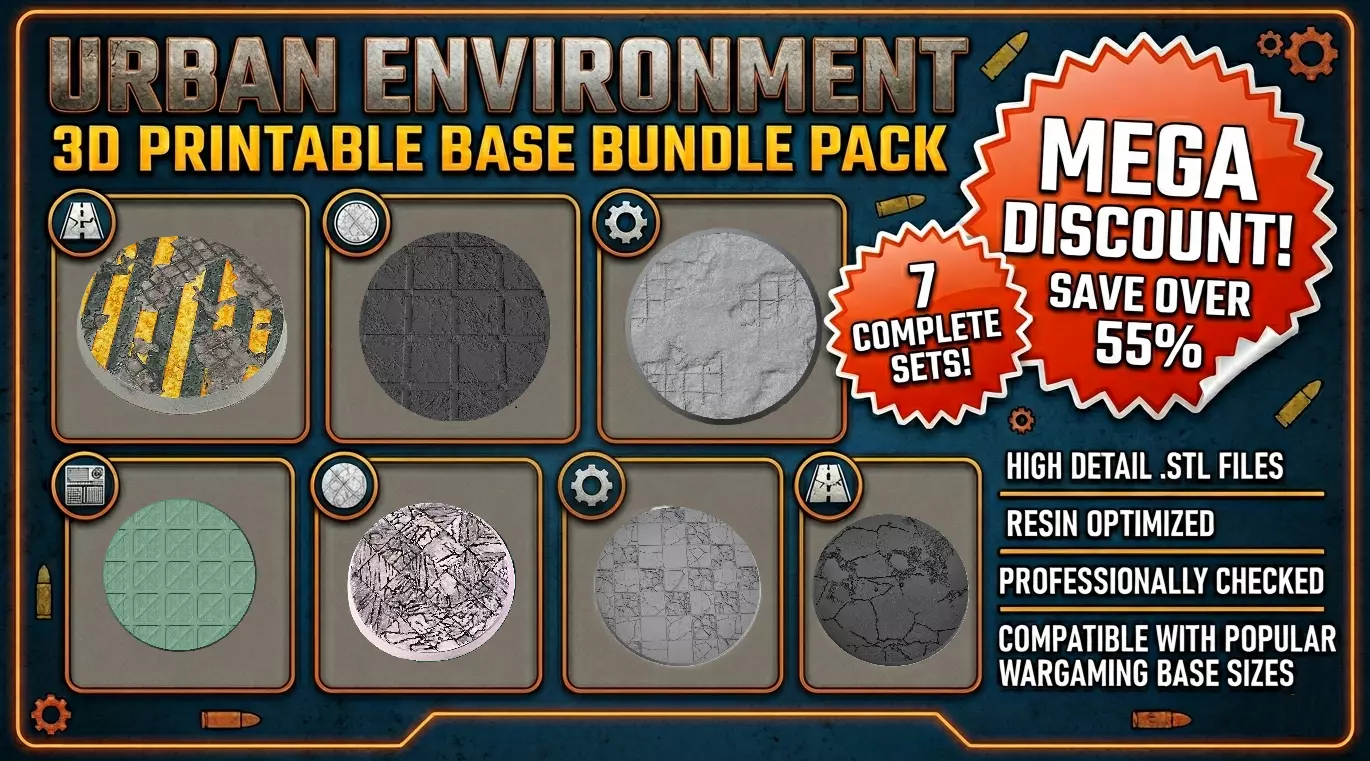 This bundle brings together 7 distinct Urban themed base sets, designed to provide a gritty, realistic foundation for your miniatures. Whether your forces are advancing through shattered city streets, grand marble plazas, or industrial docking bays, this collection offers high-detail textures to suit various urban combat zones.
