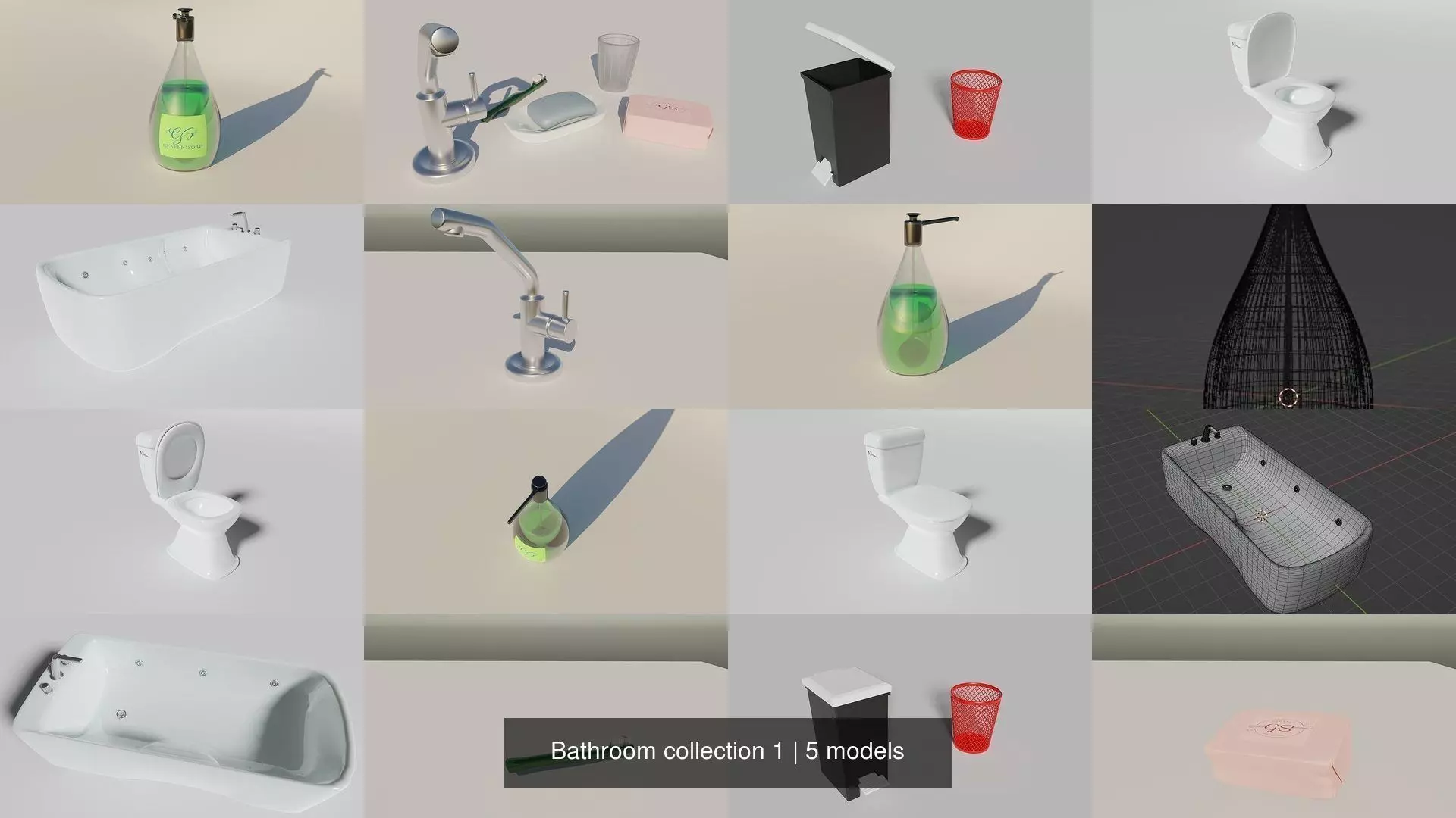 A small collection of some bathroom propsThis pack includes:1 Toilet1 Bathtub2 Trashcans1 faucet1 open soap bar and 1 package1 soap bar holder1 tooth brush1 cup (so you can store your tooth brush lol)1 liquid soap bottle