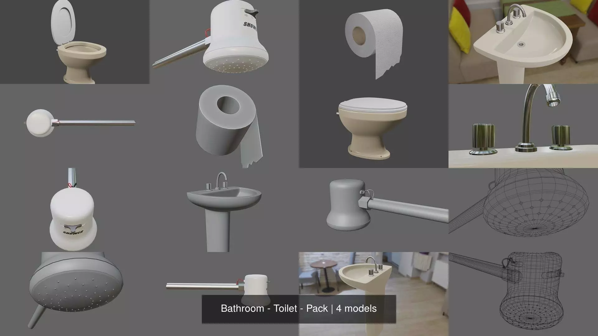 In this pack you have the basic models to create a Bathroom or Toilet.Please click in each product link to see a detailed description.