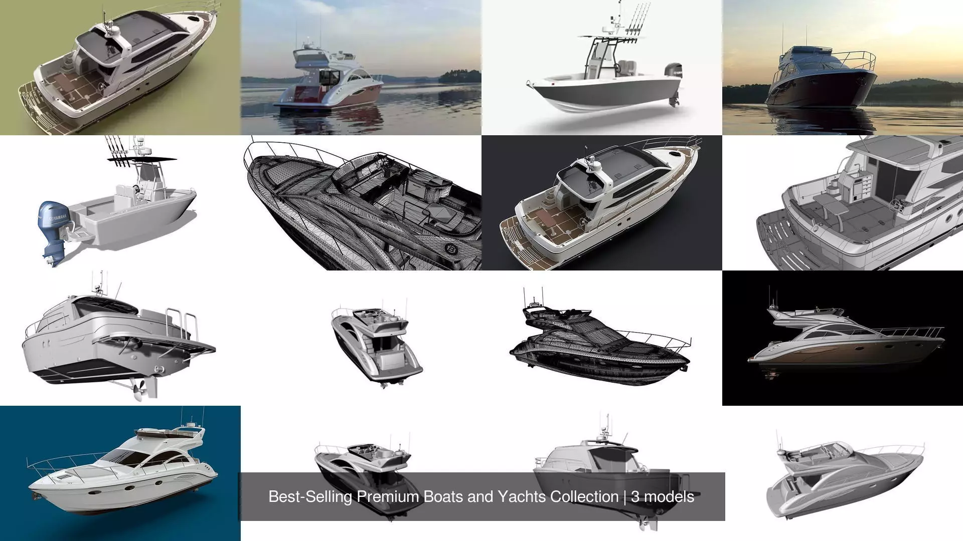 The collection includes a modern small fishing boat, a sport utility boat, and a luxury yacht, covering a wide range of use cases from marine simulations to product renders. All models are optimized for smooth workflow integration and easy material customization.