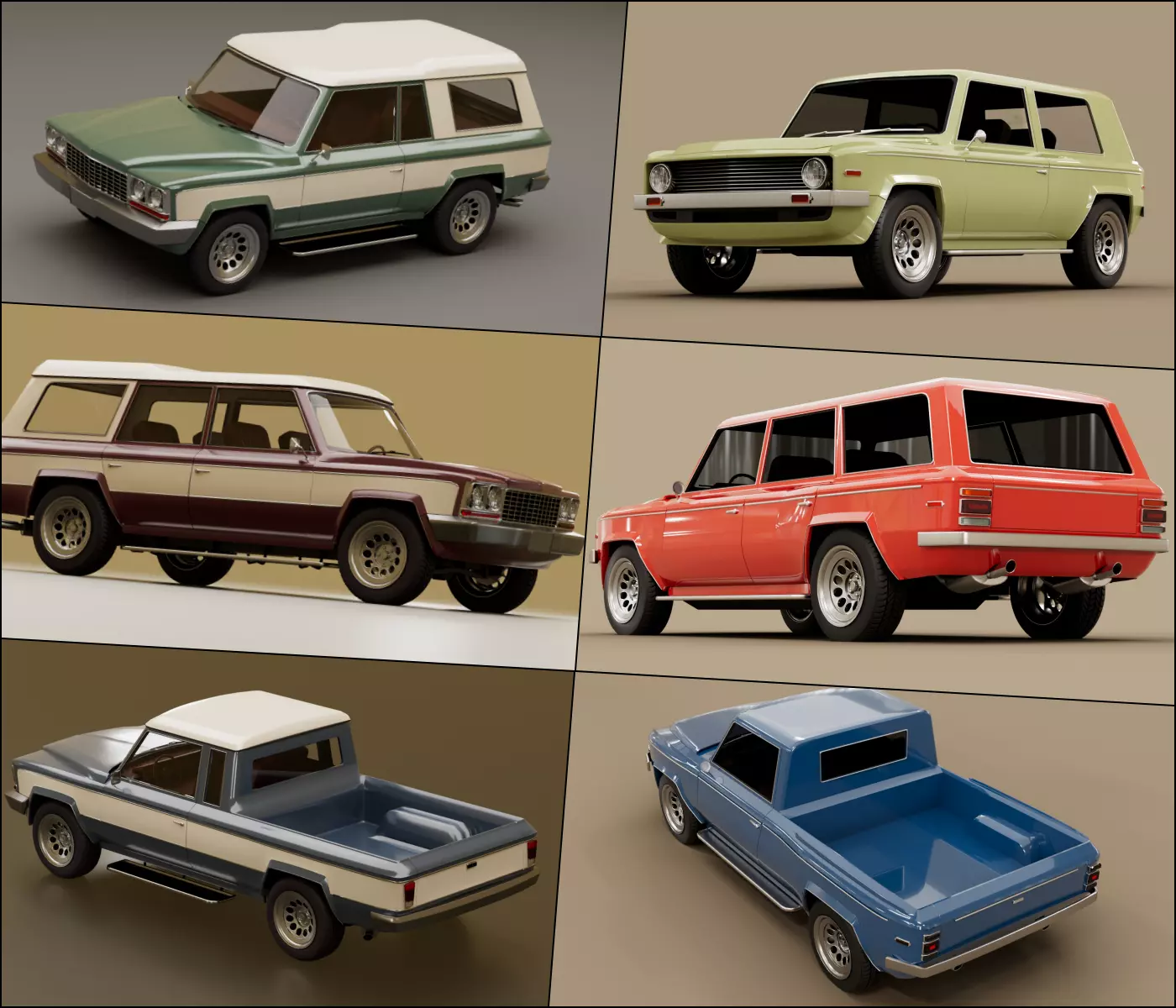 About pack: Pack contains 70s style generic SUV's/Pick-up trucks. The task was to create models that will be used as a game assets or to fill the backgrounds of the scenes. Design of the models were inspired by 70s muscle cars and american cars.