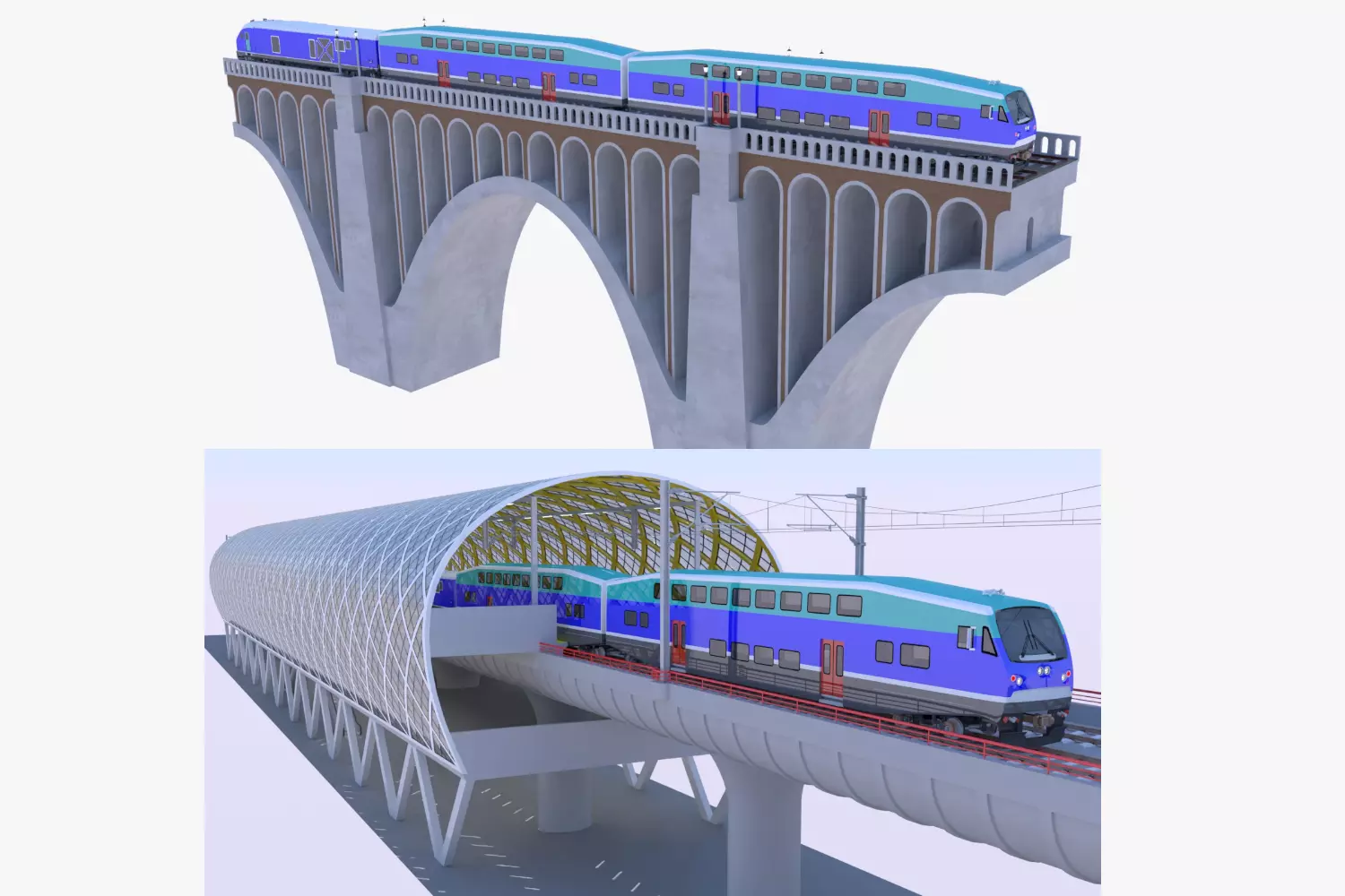 These are 3D models of station and viaduct with Bombardier BiLevel wagons with locomotive Siemens SC-44.